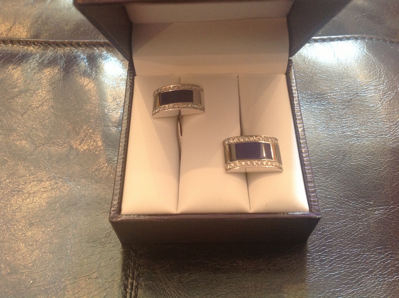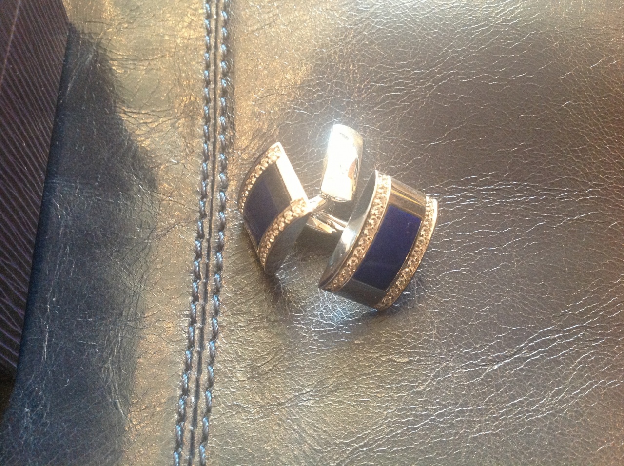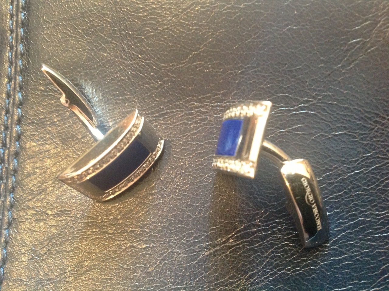 Шикарные запонки от Giorgio Visconti из белого золота 750 пробы,украшенные синей эмалью и бриллиантами. Вес 15,4. Состояние идеальное+ (только примерял).На рубашке, смотрятся очень достойно! Цена 2300$.