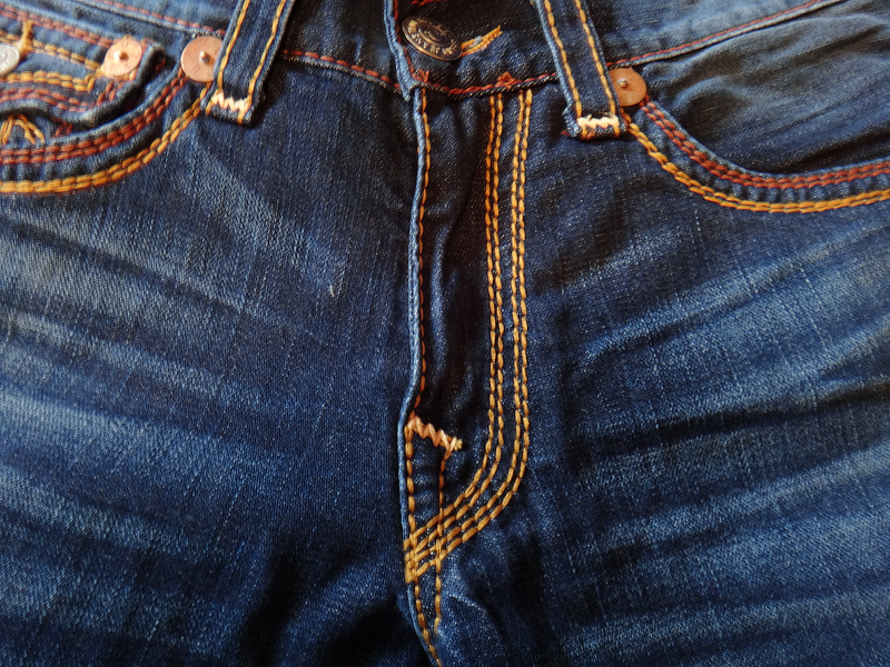 В линейке "Big Qt" используется двойная прострочка, что еще больше усиливает эффект контраста с синим цветом самих джинсов. В данном случае, прострочка выполнена в двух разных оттенках коричневого, смотрится очень эффектно.