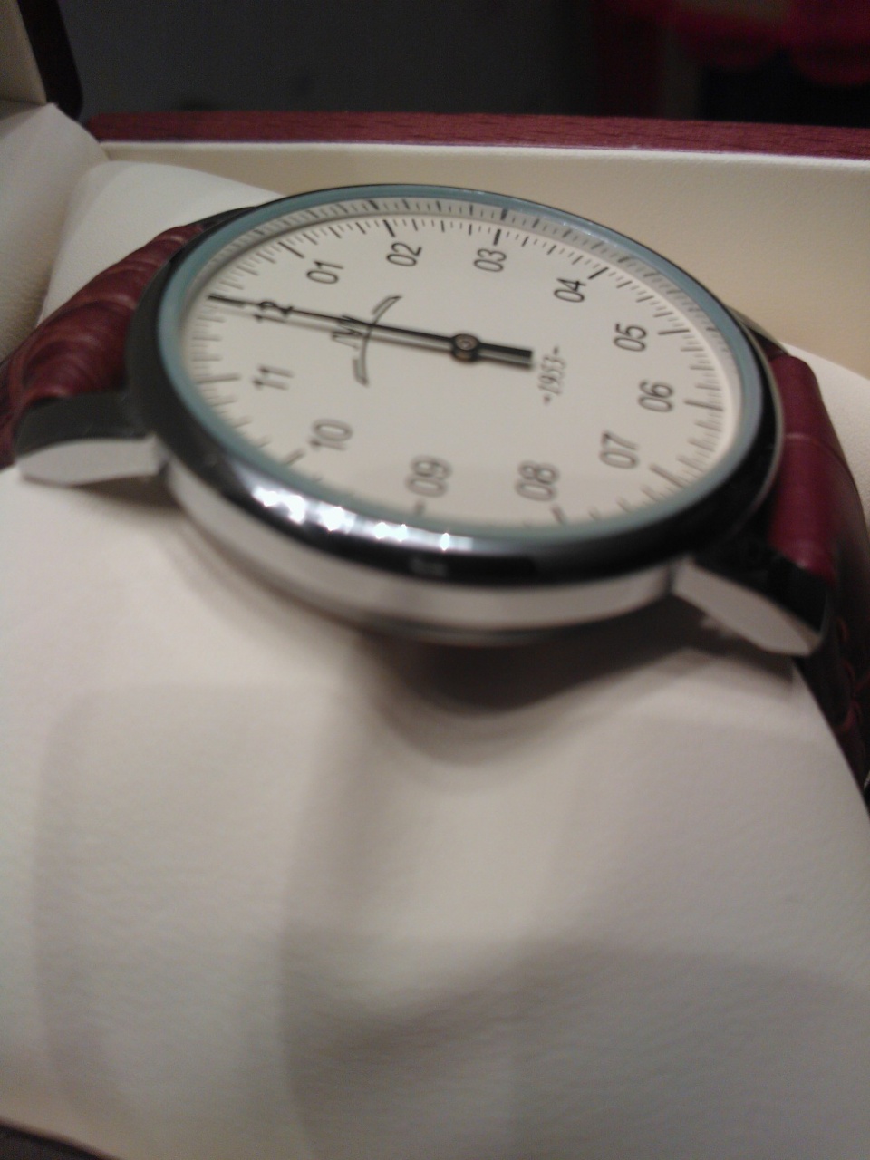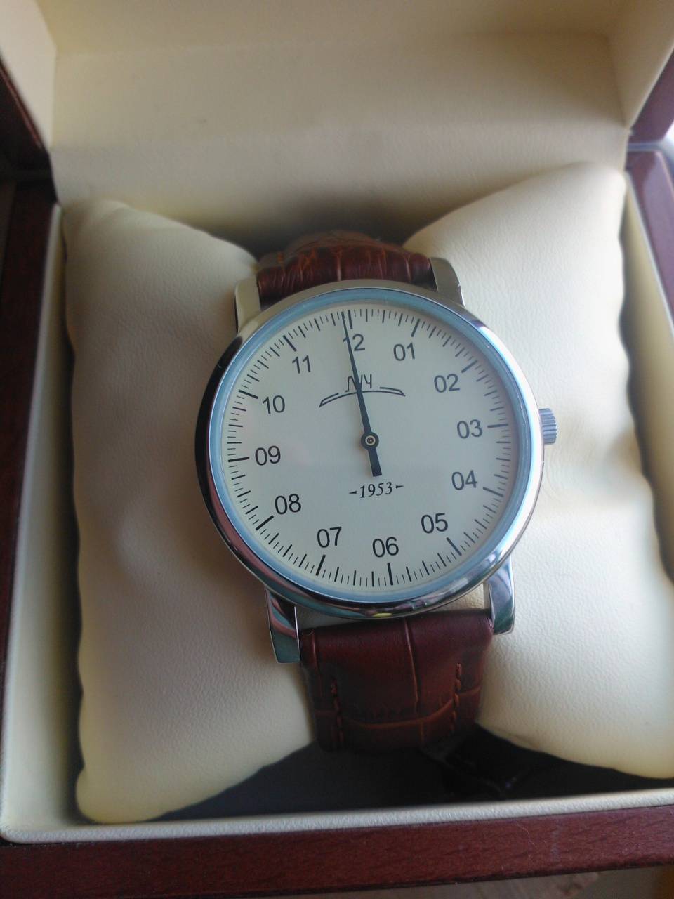 Первая лимитка рожденная совместными усилиями Минского часовога завода и форумчанами. Часы реально одевались оди или два раза. Ремень заменен на рыжий (он гараздо больше подходит этим часам) но родной черный тоже имеется (с парой лишних отверстий