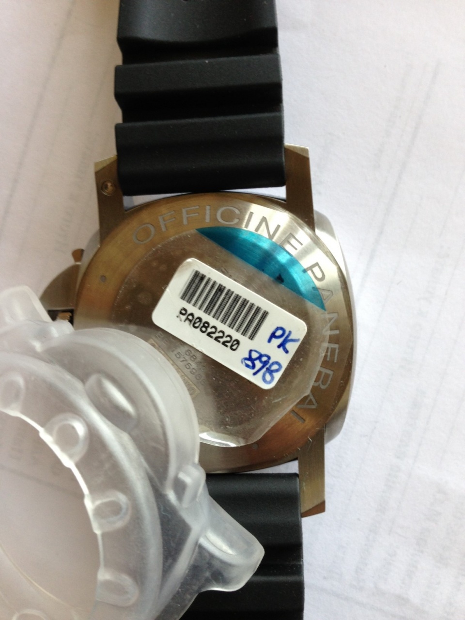 Сатинированный титановый корпус диаметром 47 мм, водонепроницаемый до 300 метров. Вращающийся однонаправленно дайверский безель с керамической вставкой. Сапфировое стекло, черный циферблат с накладными часовыми индексами и стрелками, покрытыми люминесцентным составом. Мануфактурный механизм Panerai P.9000 с автоматическим заводом и трехдневным запасом хода. Антимагнитная защита - 40000А/м. Куплены у официального дилера в июле 2013.