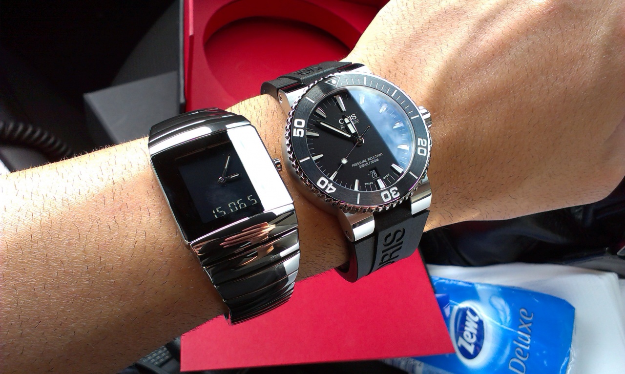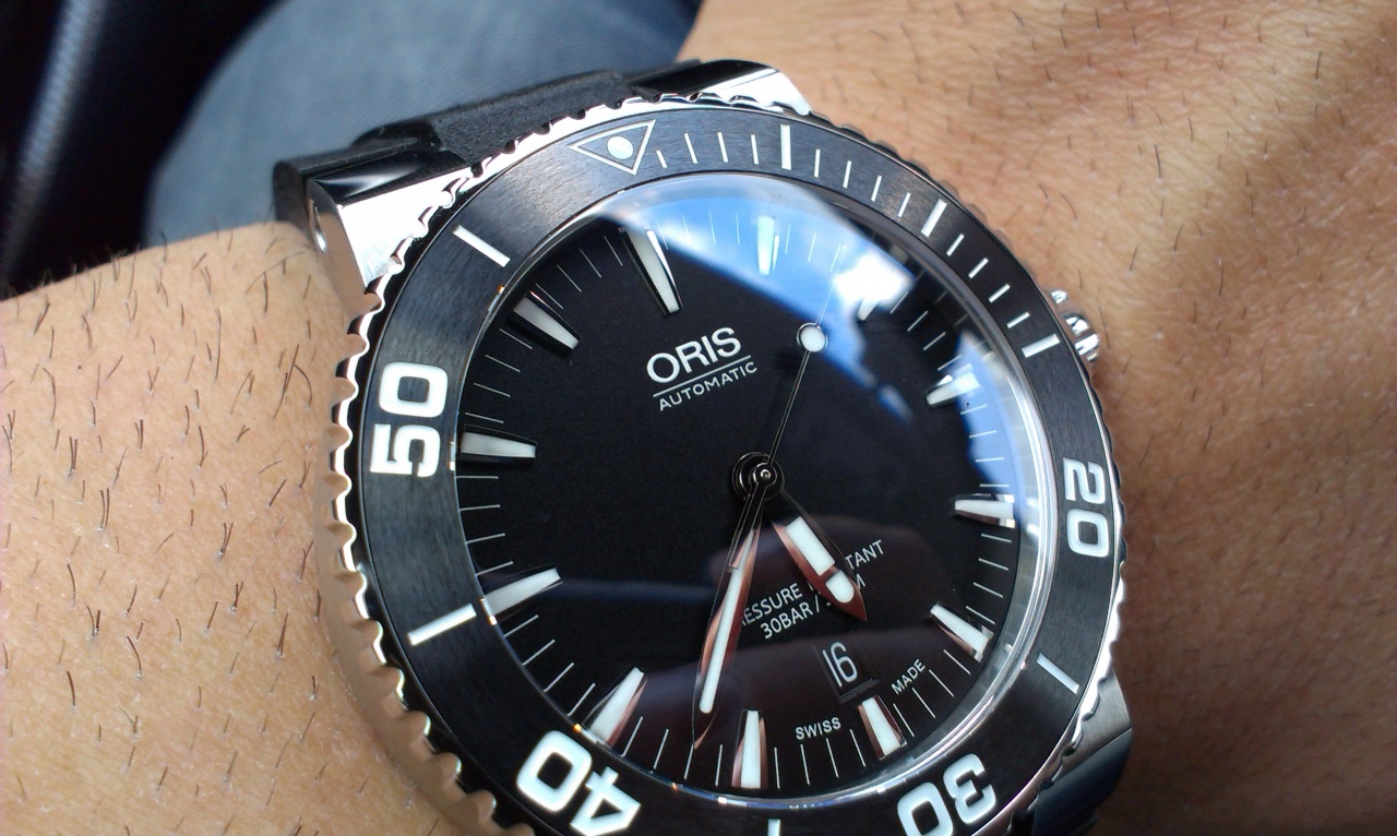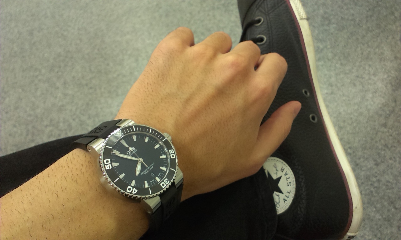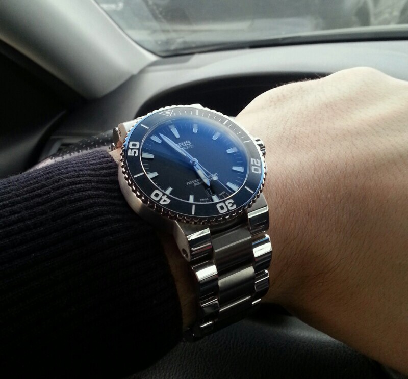 Дайверс синий с волнами нравится тоже, но они более спортивные- Аквис чуть лучше и проще сочетается с одеждой. Визуально 43мм Аквис засчет более широкого безеля выглядит значительно крупнее 44мм Дайверса. Дайверс на руке чуть удобнее- головка меньше выступает и корпус более закругленный со стороны дна.