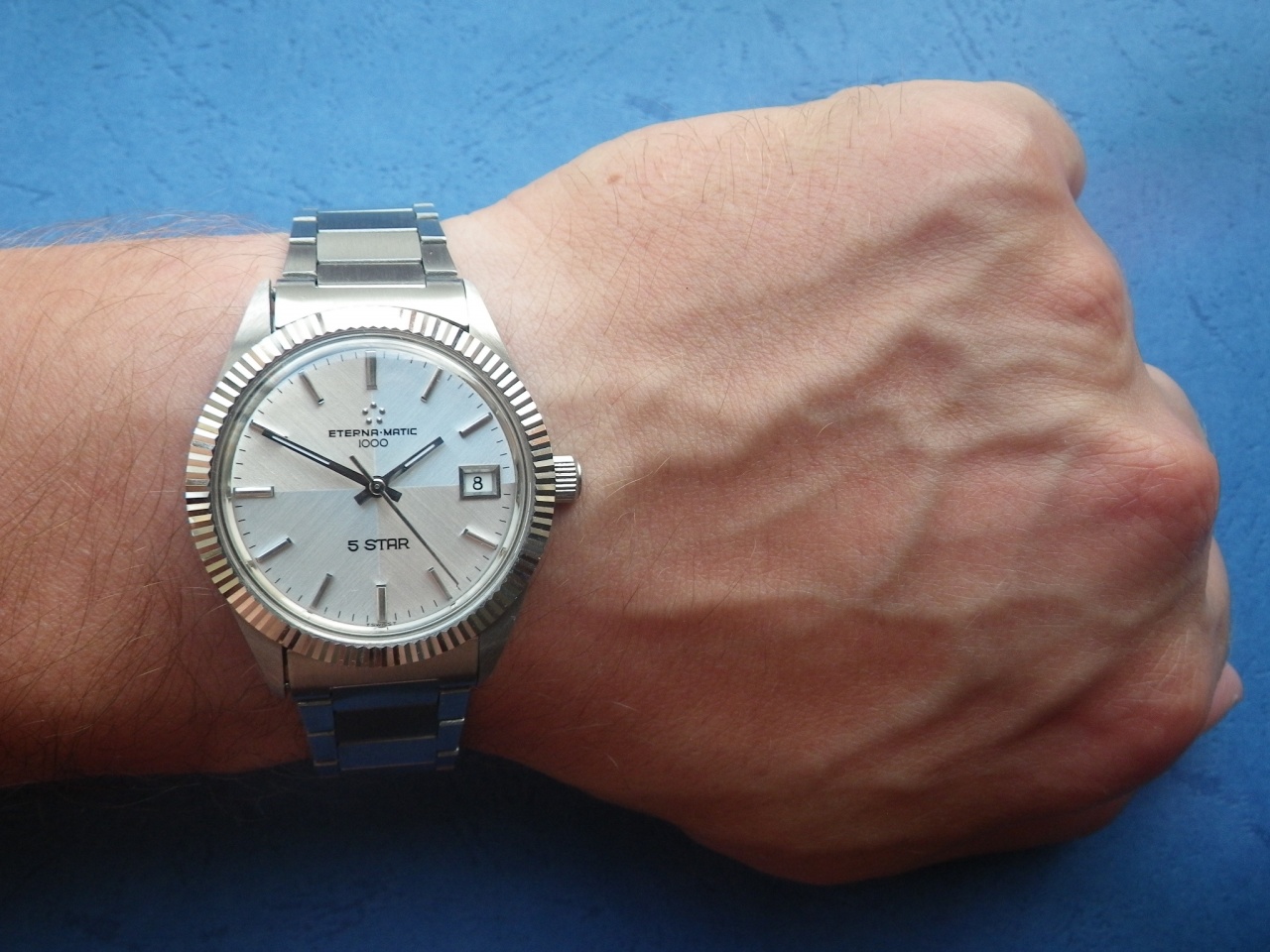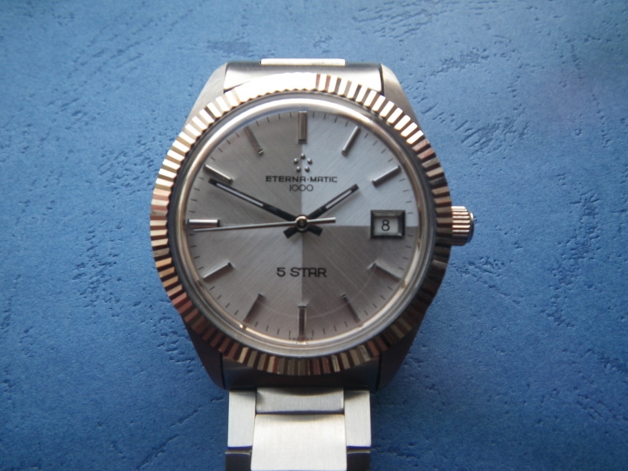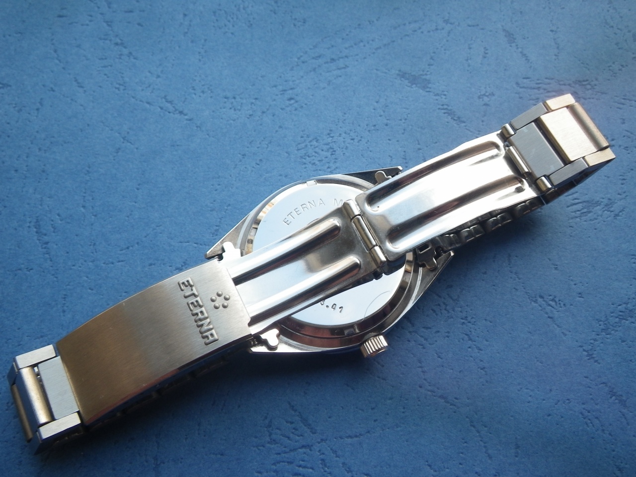 Плексигласовое стекло, фирменный швейцарский механизм с автоподзаводом Eterna-Matic, дата, потрясающей красоты циферблат.