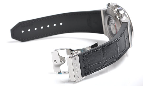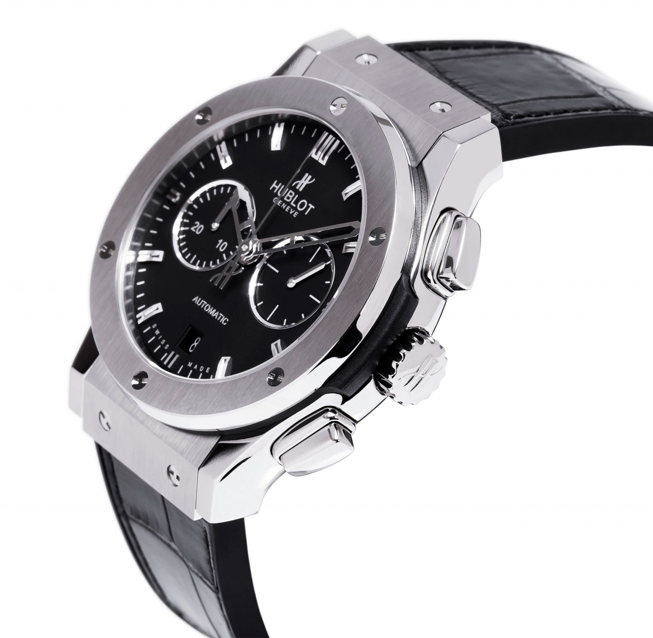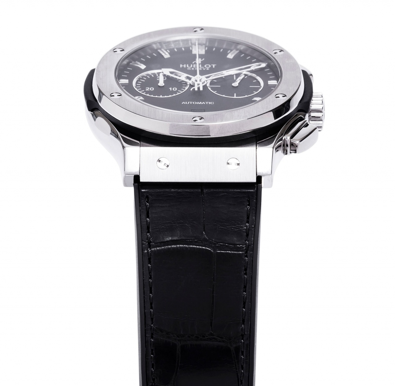 Очередная великолепная модель мужских наручных часов Fusion Chronographe Titanium 45 mm 521.NX.1170.LR от производителя Hublot не оставит к себе никого равнодушным, потому как завораживает своим внешним классическим видом и функциональностью. Несомненно одно из главных достоинств данной модели это наличие хронографа. Круглый корпус выполнен из прочного материала титан, и имеет 45 мм в диаметре. Автоматический механизм данной модели оснащен калибром HUB 1143 и имеет запас хода на 42 часа. Прочные сапфировые стекла, устойчивые к царапинам и другим повреждениям закрывают корпус с обеих сторон. Апертура с датой находится на позиции 6 часов. На черном циферблате шикарно смотрятся отлитые вручную посеребренные стрелки. Водонепроницаемость модели составляет 50 метров. Ремешок черный, выполнен из кожи крокодила, оснащен титановой вставкой, и раскладной застежкой.
