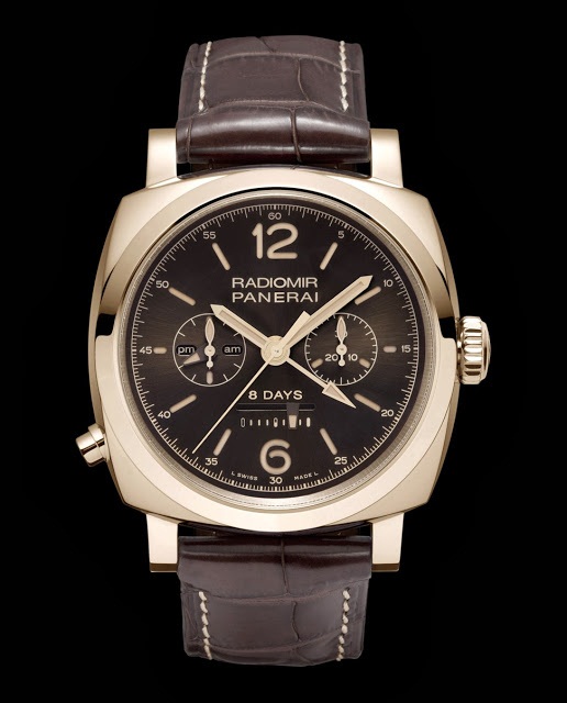 Мануфактура Panerai представила два новых хронографа серии Radiomir 1940 - PAM502 и PAM503 в корпусе из розового и белого золота 18к. Новинка оснащена Калибром с ручным заводом P.2004/10 с великолепным финишем. Panerai Radiomir 1940 Chrono Monopulsante 8 Days GMT PAM502 и PAM503 выпущены ограниченной серией 300 штук в корпусе из розового золота и 150 штук в корпусе из белого золота. Диаметр корпуса составляет 45 мм. Часы представляют собой однокнопочный хронограф с тремя барабанами и 8-дневным запасом хода.