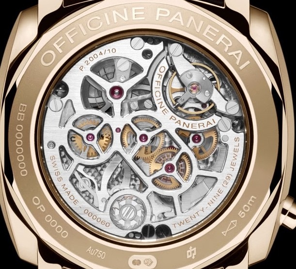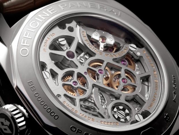 Механизм часов декорирован вручную, его главная платина на ¾ скелетирована. Как и все механизмы Panerai, этот полностью разработан и создан в стенах мануфактуры. Внешний вид Калибра излучает надежность, точность и привлекательность. Стоимость новинки составляет около 50000 $.