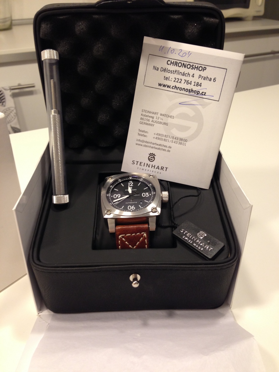 Покупались 11.10.2011 г. у официального дилера Steinhart - компании Chronoshop, в Праге. Чек, коробка, документы имеются. Часы носились аккуратно около года. В часах ни плавали, ни ныряли, ни разбирали. Последний год лежат без дела, только периодически завожу их.