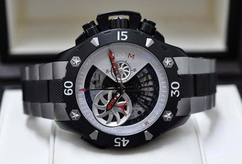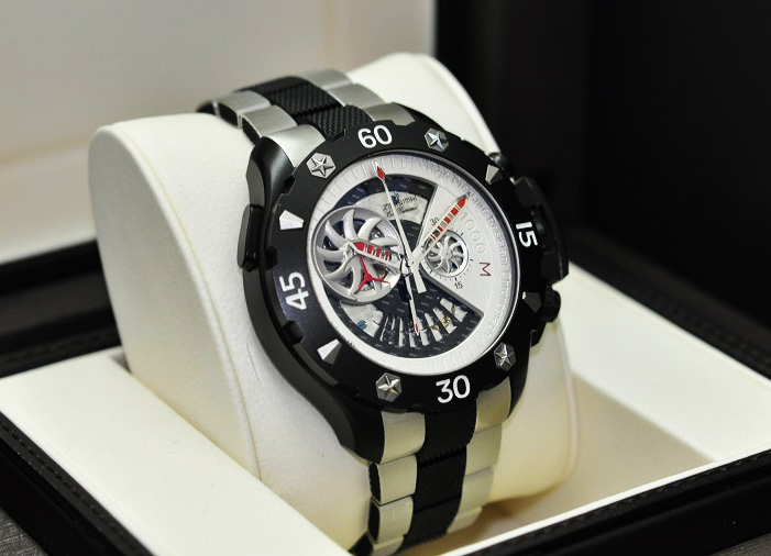 Watcharena: Корпус – титан, PVD, диаметр 46.5мм. Имеет двойное сапфировое стекло и водонепроницаем на глубине 1000 метров. Механизм - автоматический El Primero 4021 SX, состоит из 248 деталей, с запатентованной противоударной защитой Zenithium Z Bridges, мосты выполнены из сплава Зенитиум (титан-алюминий-ниобий). 39 деталей из драгоценных металлов. Имеет запас энергии 55 часов.