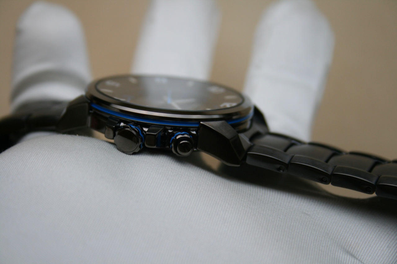Размеры: 39.7 мм в диаметре без выступов корпуса (42.3 мм включая заводную головку), 45.2 мм по краям дужек, 11 мм в высоту