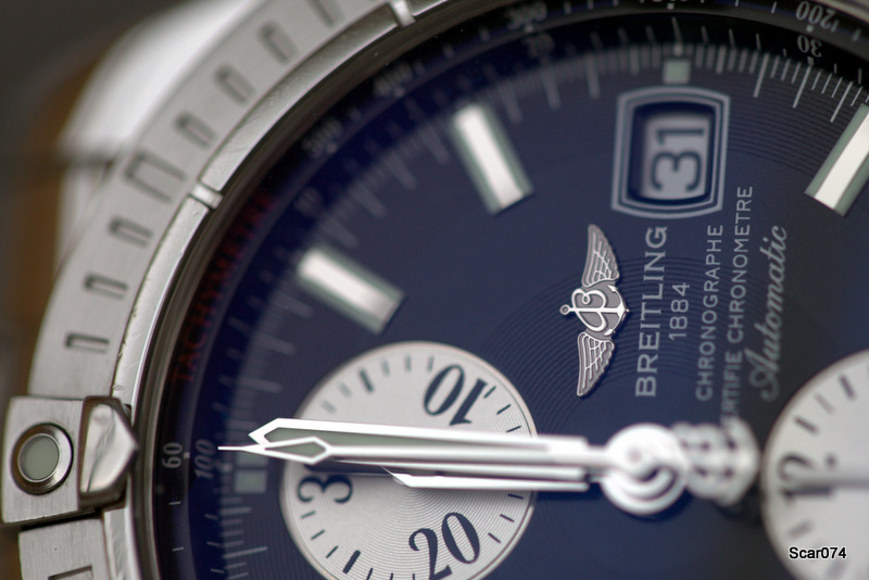 - полированные часовые риски и часовая с минутной стрелкой частично покрыты светонакопительным составом, основной графитовый циферблат с тремя серебристыми дополнительными циферблатами (накопители -«30мин», «60 мин», «12 час»), минутная с часовой стрелкой по форме напоминают мечи, секундная – копье, отличительная особенность – полированная секундная стрелка с вензелем в форме «В» с якорем, циферблат украшен надписями и знаменитыми крылышками Breitling – крылатая буква «В»;