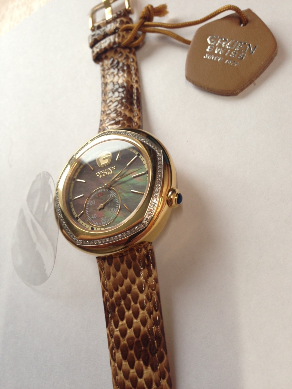 Фирменная "корона G" и клеймо Swiss присутствуют на циферблате.