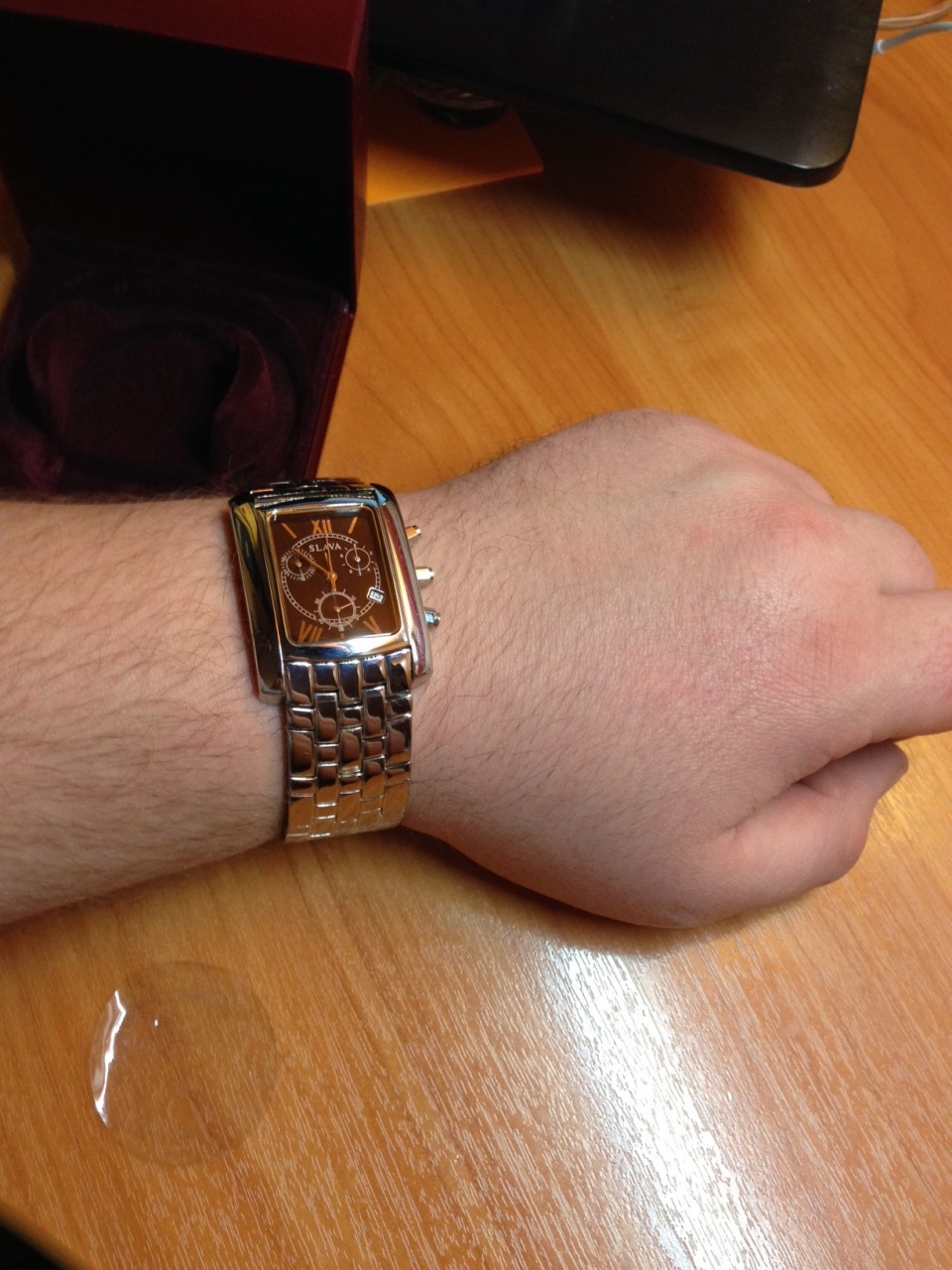 Черный текстурированный цифер, стальные римские метки и мечевидные стрелки, окошко даты на четыре часа.