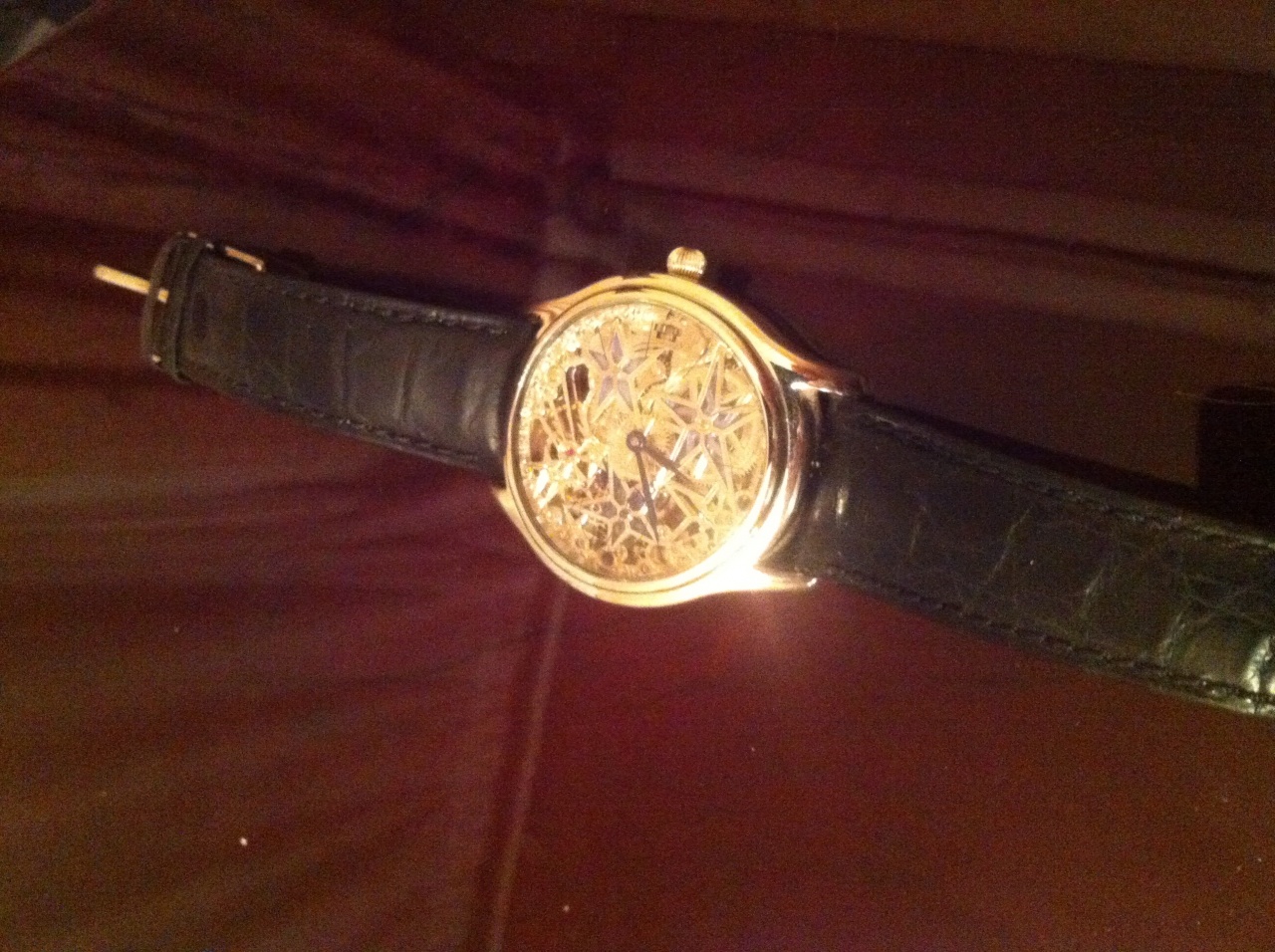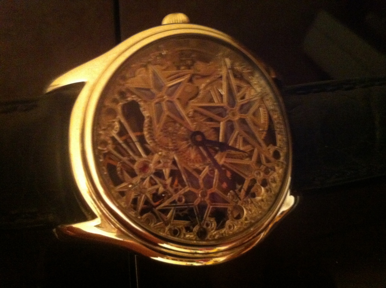 Механизм: ЕТА 6497, диаметр 36,6 мм, высота 4,5 мм, с ручным заводом, частота 18000 пк/ч., 17 рубиновых камней, художественно скелетонирован и гравирован вручную, индивидуальная обработка каждой детали, механизм покрыт родием, пряжка инкрустировна бриллиантами- 0,08 ct., с лицевой стороны часов композиция "Stars", витражная эмаль.