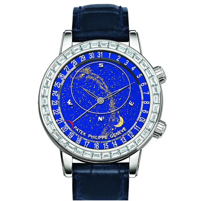 Новинка от Patek Philippe — мужские часы, декорированные 60 бриллиантами: 38 бриллиантов общим весом 4,27 к обрамляют циферблат, 22 камня общим весом 1,13 к — украшают застежку ремешка из крокодиловой кожи. 44-миллиметровый корпус сделан из белого золота, а синий циферблат представляет собой звездную карту, отображающую текущие значения углового положения звезд, фазу и орбиту Луны, а также время прохождения меридиана Сириусом и Луной. Часы оснащены индикатором даты (третья стрелка с красным наконечником) и механическим калибром 240 LU CL C, обеспечивающим 48-часовой запас хода.