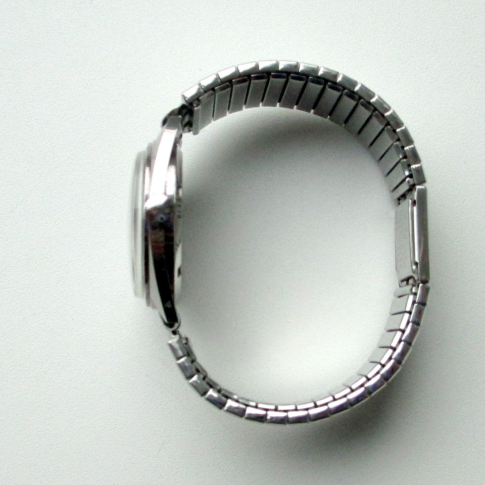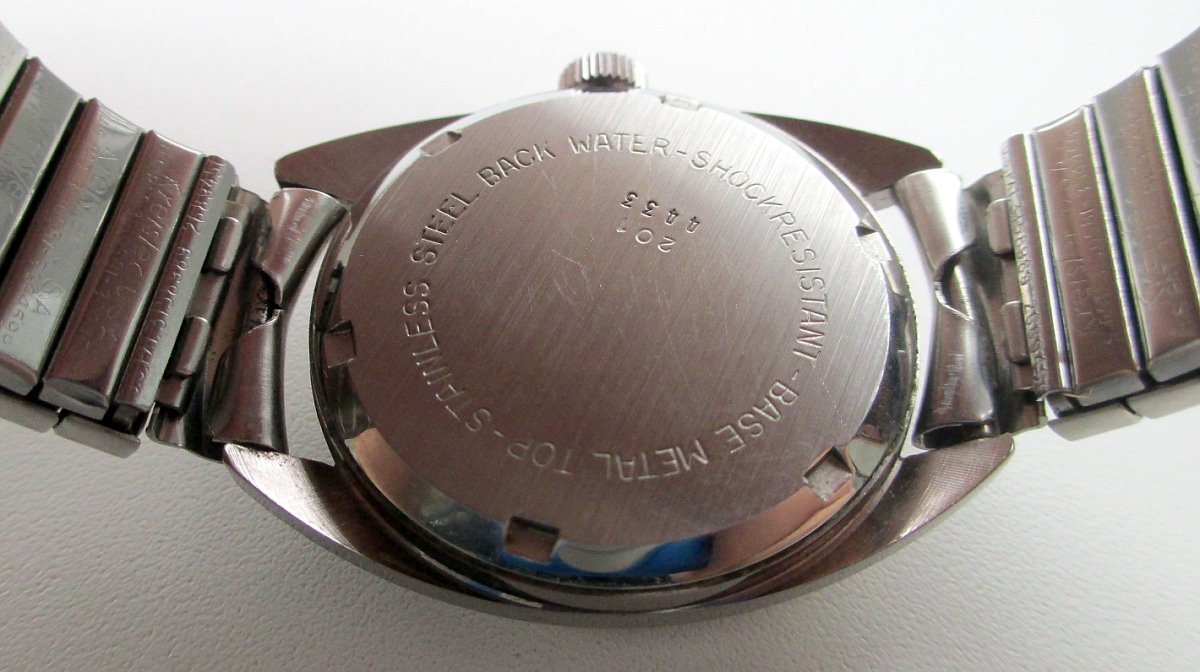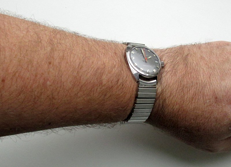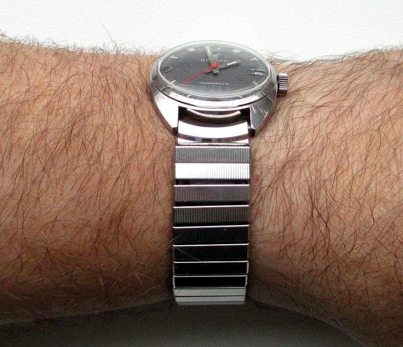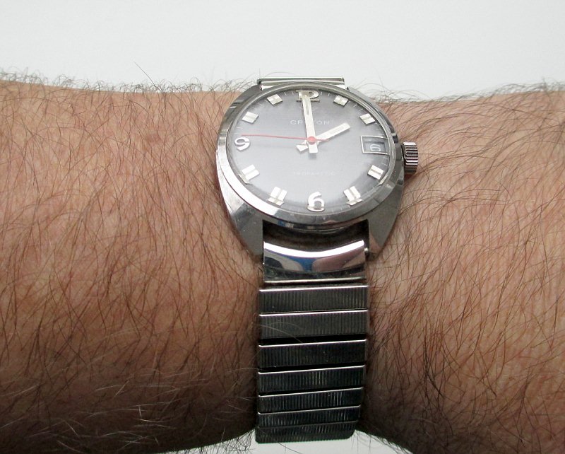 Относительно возраста часов соображения у меня такие. Во-первых, они относятся к швейцарскому периоду фирмы Croton, то есть до начала 1990-х. С другой стороны, стекло в них минеральное, а не акриловое - стало быть, уже не 60-е или 70-е, а 80-е годы. Но с третьей стороны, стекло еще не заподлицо с корпусом, а выступает миллиметра на три - значит, скорее, начало 80-х. Для столь почтенного возраста состояние часов удивительно хорошее. Следы эксплуатации сводятся к малозаметным царапинкам и потертостям в обычных местах на стекле, задней крышке, кассете с календариками на браслете - подробнее см. фотки. Эластичные стальные браслеты обычно соскребают с руки владельца и хранят в себе тонны грязи - у этих часов ничего подобного, браслет идеально чистый, как будто его носил робот. Идут часы точно и ровно, дата переводится без проблем. Полного завода, как положено, хватает примерно на полтора дня.