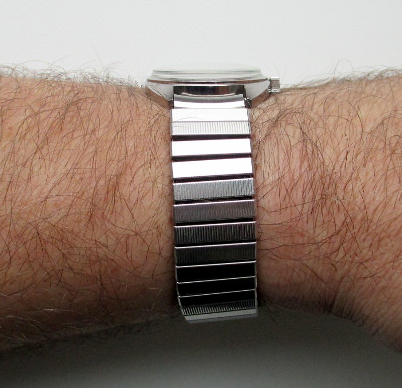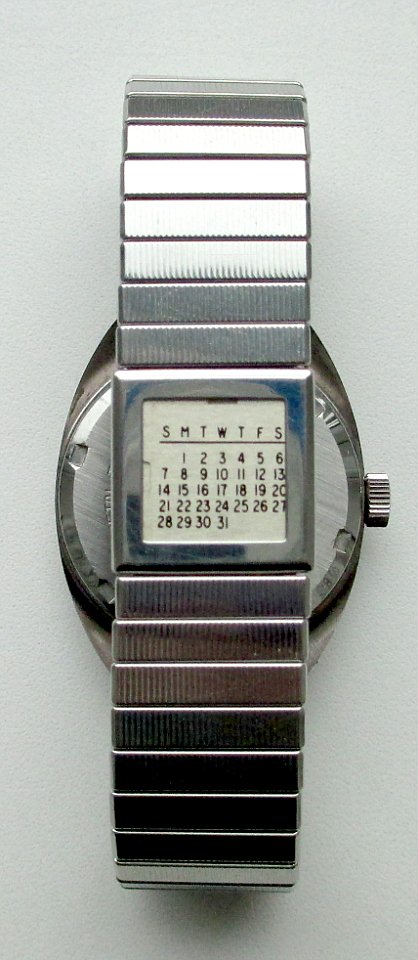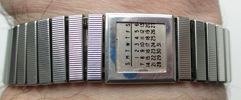 Вторая изюминка этих часов - табель-календарь, встроенный в браслет (см. фото). Точнее, в браслет встроена кассета со сменными месячными календариками для всех вариантов дня недели, на который может выпасть 1-е число. Я таких вещей до сих пор не встречал.
