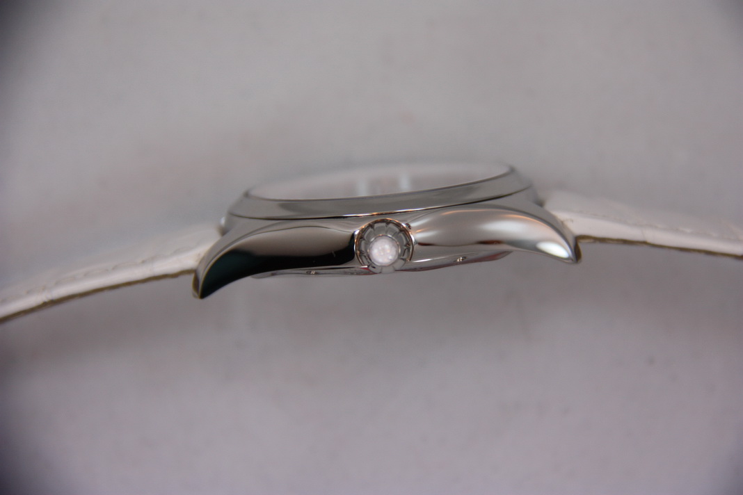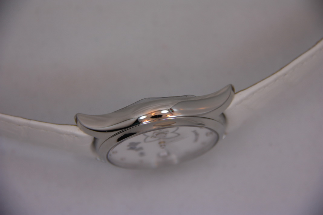 12 бриллиантов; часы, минуты, секунды на отметке 9 часов, дата на отметке 3 часов.