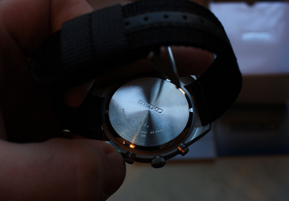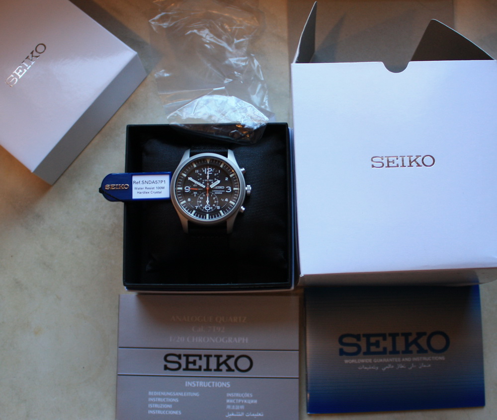 Мужские кварцевые часы. Корпус этих часов крупного размера (44 мм.) и выполнен из нержавеющей стали. Модель SNDA57P1 имеет стекло хардлекс, текстильный ремешок чёрного цвета, чёрный циферблат. Водоустойчивость: 100 метров. Дополнительные функции и особенности: дата, хронограф. Полная заводская комплектация Seiko