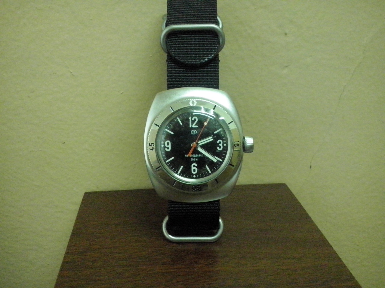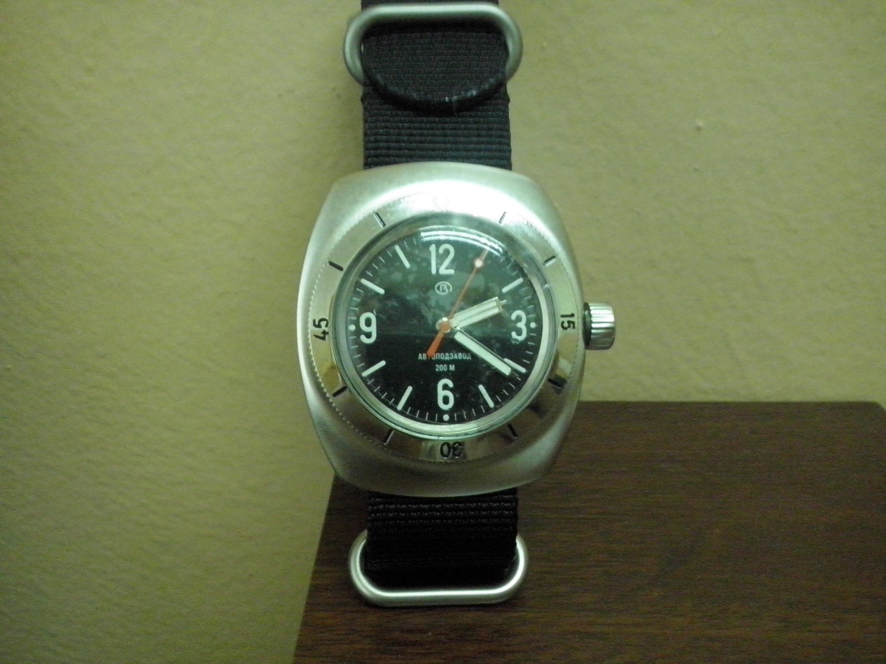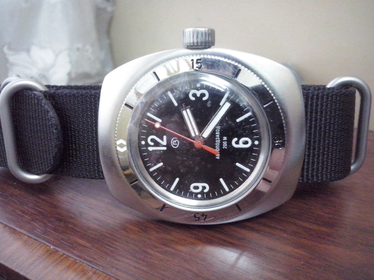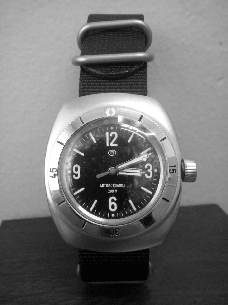 Легендарный отечественный дайвер, Амфибия Спецсерия 090SE Амфибия Классика 2415 090555MBN. Ремень нато черный, бочка в 090-м матированном корпусе (завод в декабре сдал уважаемому Мераному только 2 штуки), в живую очень впечатляет, секундная стрелка еще красная, т.к. потом в этом «кузове» уже идет стрелка серая. На задней крышке «мужик с пузырем», спецзаказ. Безель из нержавеющей стали. Светящиеся индексы и цифры. Часы с центральной секундной стрелкой. Механизм 2416 (числа нет). Автоподзавод. Водонепроницаемый корпус. Запас хода не менее 31 часа. Противоударное устройство узла баланса. Число рубиновых камней - 31. Средний суточный ход -20 +60 сек/сут. Водонепроницаемость 200 м.