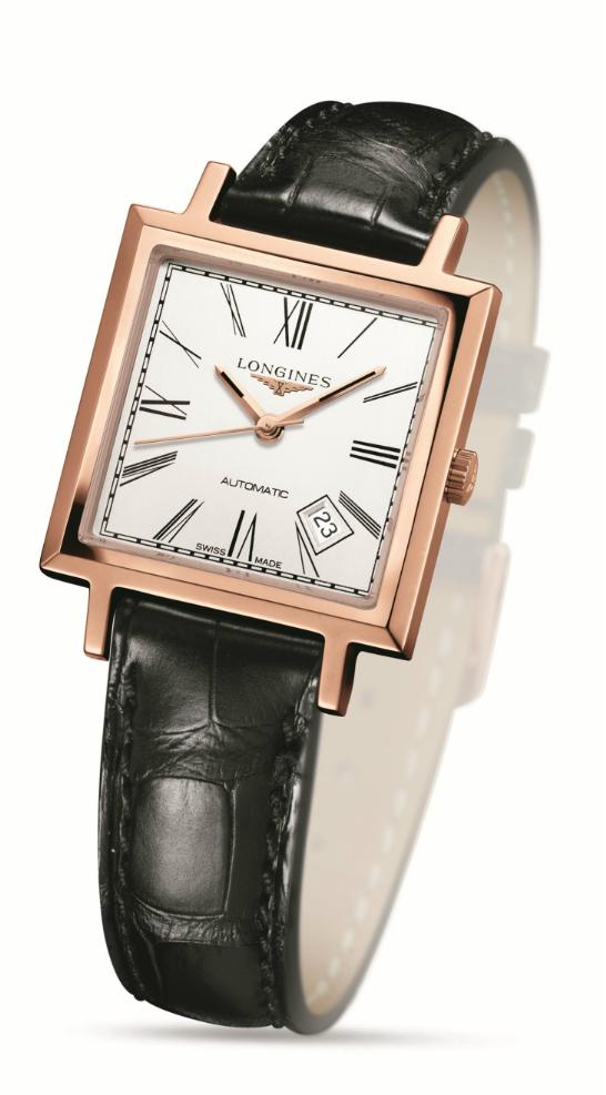 Квадратный корпус изготовлен из нержавеющей стали или из 18-каратного розового золота, водонепроницаемый до 30 метров. На торце рифленой заводной головки, расположенной на 3 часах, выгравирована эмблема бренда Longines. Сапфировое стекло с антибликовым покрытием защищает циферблат серебристого цвета с напечатанными черными римскими цифрами. Стрелки родированые или позолоченные.