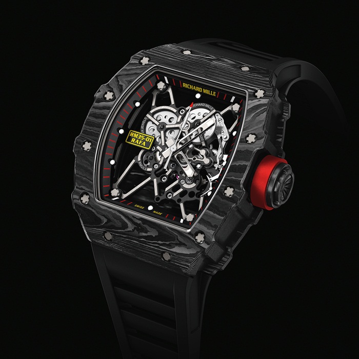 Часы Richard Mille RM 35-01 Rafael Nadal выполнены из того же карбона NTPT®, а внутри находится механизм, который способен испытывать сильнейшие перегрузки (хоть автогонки, хоть игру в теннис) и весит всего 4 грамма. Цена уточняется.