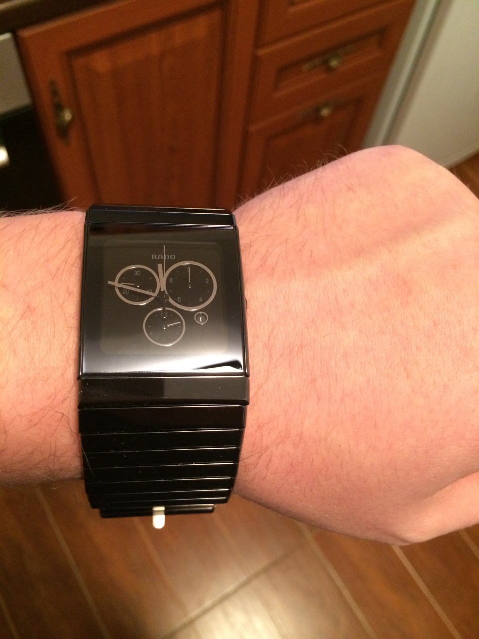 Rado Ceramica R21714152 - мужские кварцевые часы. Корпус этих часов среднего размера (35 мм.) и выполнен из керамики. Модель Ceramica R21714152 имеет сапфировое стекло, керамический браслет чёрного цвета, чёрный циферблат. Водоустойчивость: 30 метров. Дополнительные функции и особенности: дата, хронограф. Полная заводская комплектация Rado.
