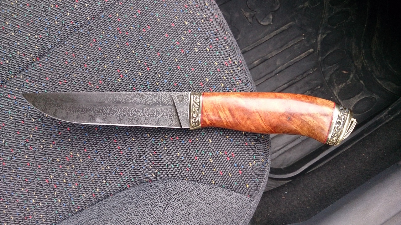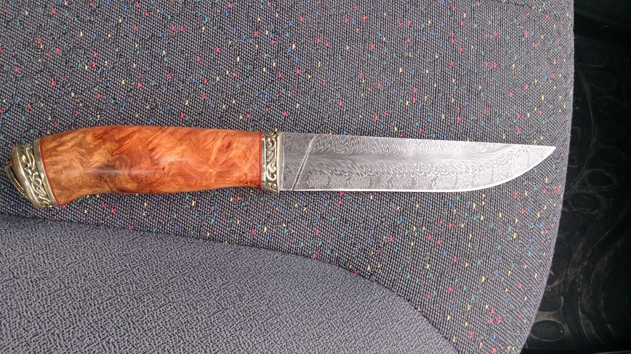 Продам нож из личной коллекции, клинок Тихомирова многослойный дамасск 115/30/4 общая длинна 290, рукоять AMBOYNA , больстер и навершие из латуни.Ножны кожа КРС подвес свободный.Нож заточен. Автор работы известный в ножевом мире мастер из Москвы "ED3". Пересыл в любую точку РФ ,наложенный платеж. цена 15тр.