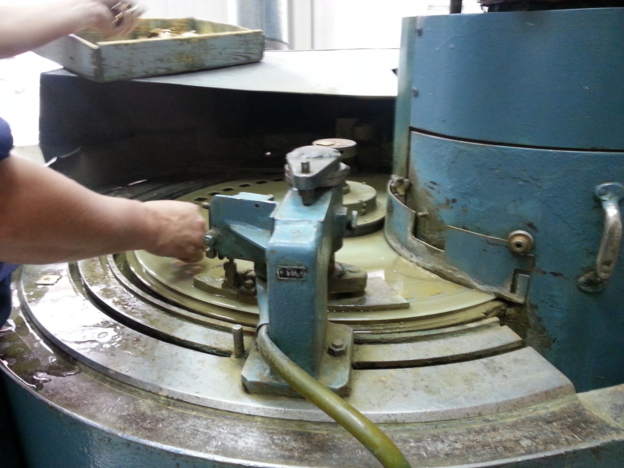 Или "полировка корпуса":на деревянную палку насаживается несколько не обработанных корпусов и сотрудник наваливается всем телом на войлочный круг, дожидаясь блеска заготовки, которые складываются в ровные горки.
