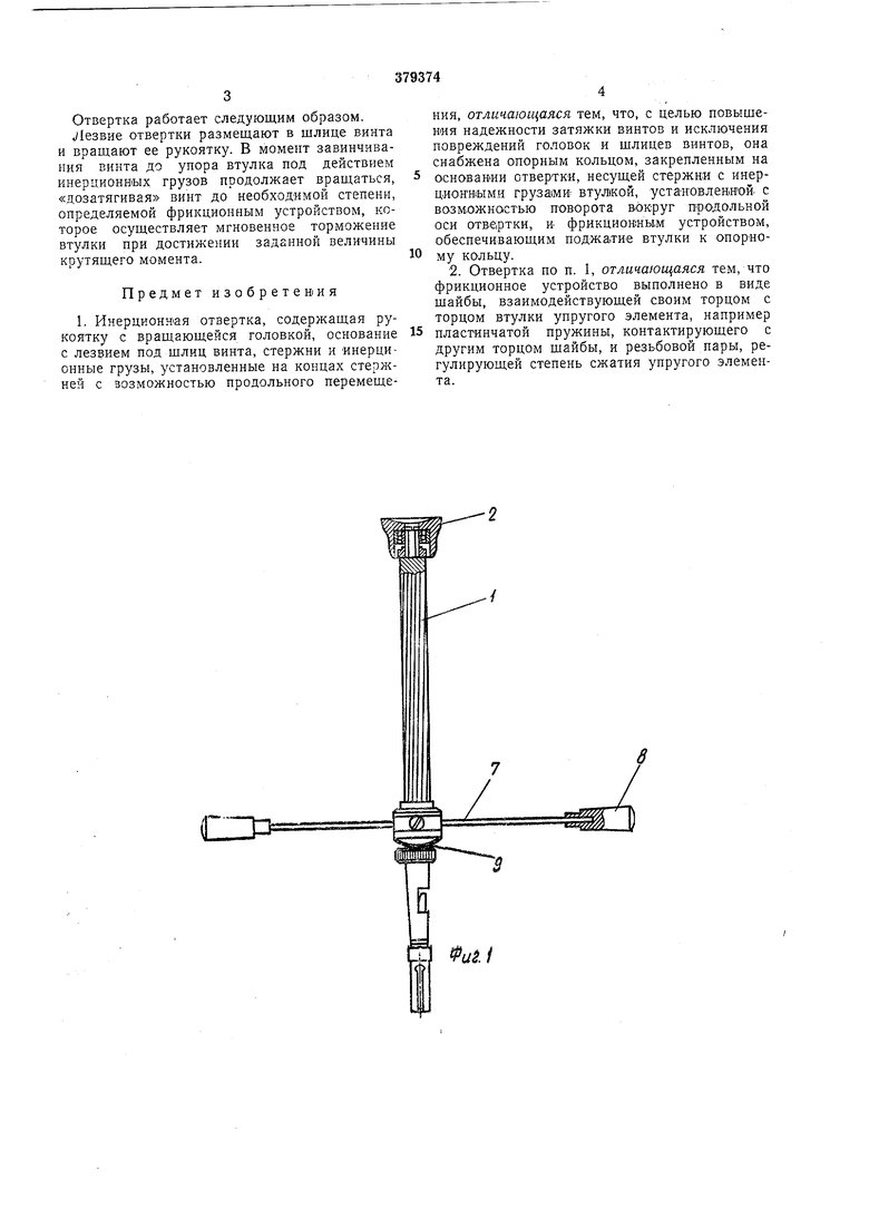Известна инерционная отвертка, содержащая рукоятку с вращающейся головкой, основание с лезвием под шлиц винта, стержни н инерционные грузы, установленные на концах стрежней с возможностью продольного перемещения.