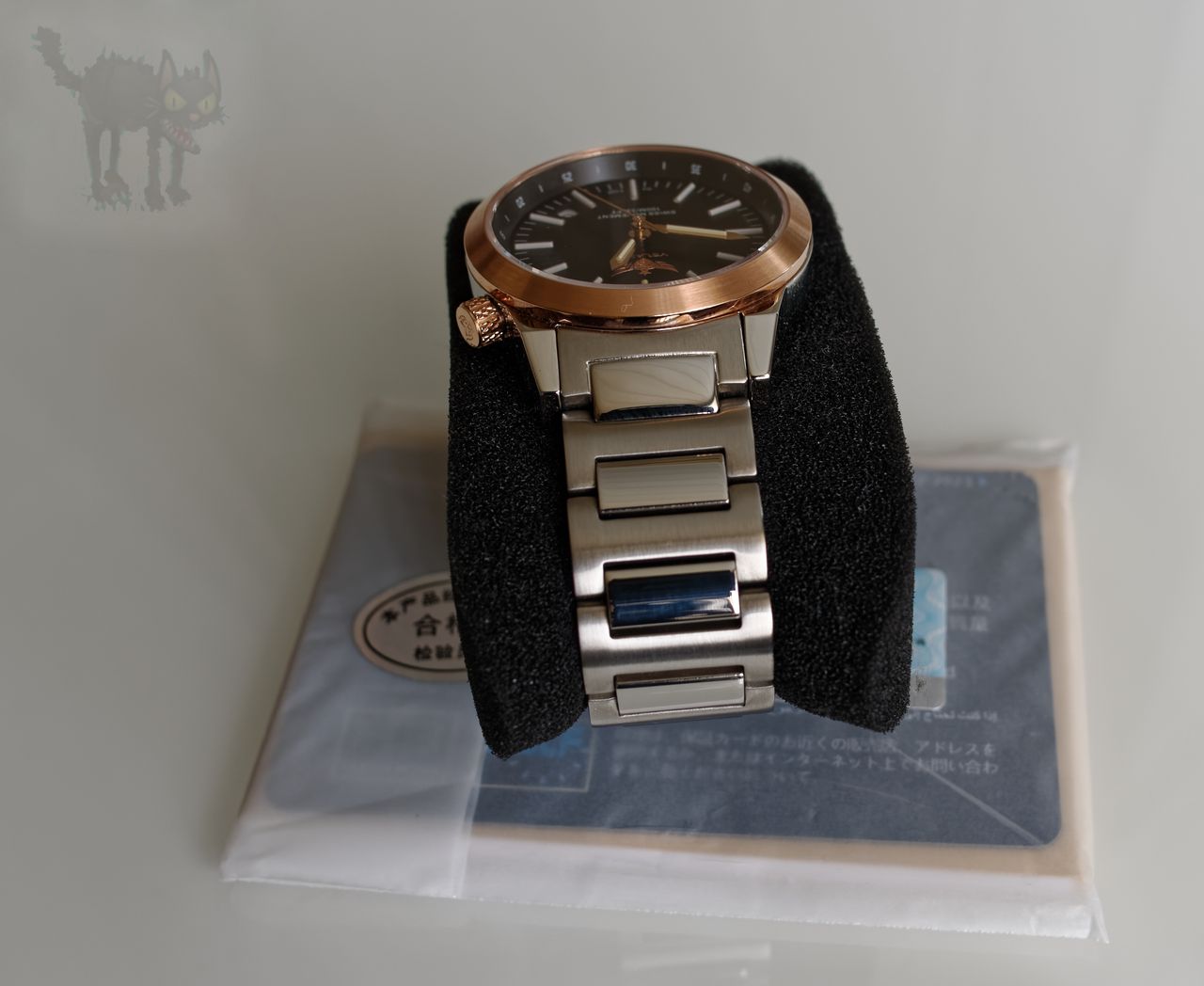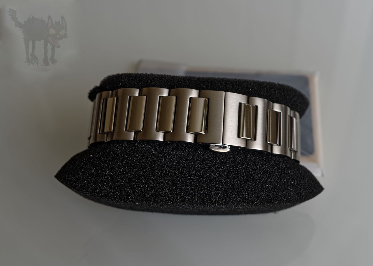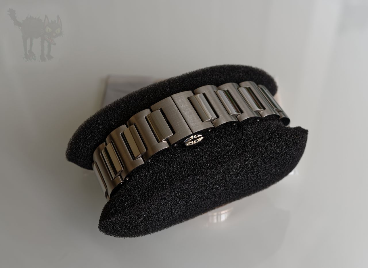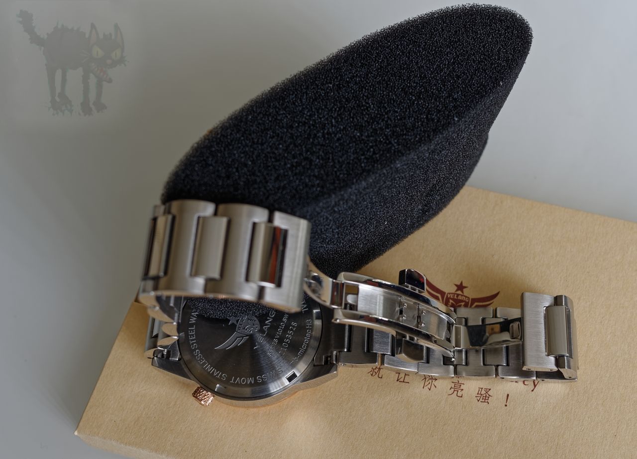 с раскладным браслетом "бабочка" и выполнен из нержавеющей стали 316L, литой. Размеры: корпус = 36 мм, от уха до уха = 45 мм, толщина корпуса = 9.5 мм, ширина ремешка = 18 мм. "Сердцем" часов служит Швейцарский кварцевый