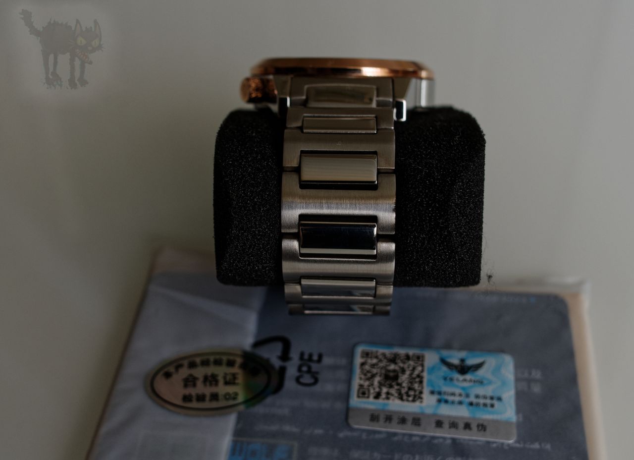 серийником гарантии, резиновый брелок, инструмент для выдавливания шпилек из металлического ремешка и инструкция. Сами часы плотно упакованы в пленки. Заводная головка имеет длинную резьбу и крупную насечку. Удобно, ухватисто. На ЗГ присутствует голова Волка в 3D. Функционал часов - часы, минуты, секунды с взломом и дата. Браслет тактильно мягкий и гладкий, без звона и задиров. Были убавлены два звена под размер запястья. Звенья хорошо обработаны и свою функцию выполняют на отлично! В замке нет щелей, при закрытии характерный щелчок работы замка, при открывании пружинит на распашку. Зазоров с крайними звеньями и корпусом часов нет! Все звенья цельные, центральные отполированы в зеркало, боковые имеют сатинированный зачес по взрослому. Задняя крышка ввинчивается в корпус и имеет указатели механизма, водозащиты (100м) и серийного номера часов. Вскрытие показало присутствие всех резиновых уплотнений. Значит можно мыть посуду))), принимать душ и плавать с трубкой и маской!