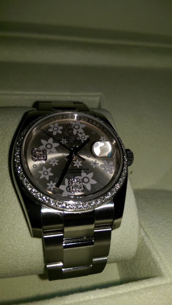 Продаю женские часы Rolex Oyster Perpetual 2013 года.Носились бережно.Дополнительно оформлены 70-ю бриллиантами по периметру и на цифрах .Коробка,карточка,инструкция в наличие.Цена 6900 usd.Торг при осмотре.