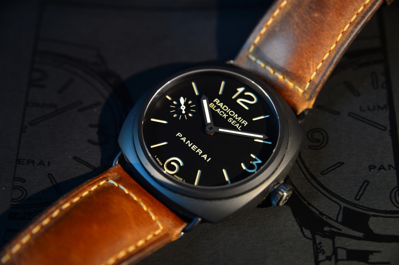 Керамический, стойкий к любым воздействиям корпус, классический, мгновенно узнаваемый дизайн Panerai серии Radiomir Black Seal в стиле "милитари". Циферблат "сэндвич" - состоит из двух слоев: нижний, покрытый фирменным люминисцентным составом и верхний с прорезными цифрами и часовыми метками.