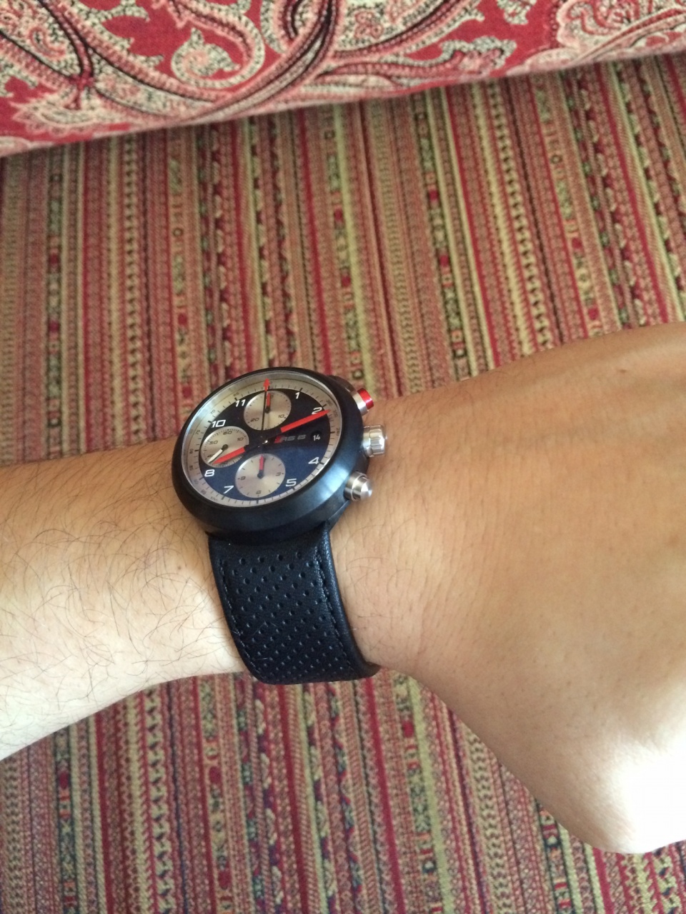 Рядом с этим хронографом в спортивном стиле время пройдет почти незаметно. Однако внутри него оно будет измерено с точностью до секунды — благодаря швейцарскому механизму ETA Valjoux 7750 с автоматическим заводом. Черный анодированный корпус и красная кнопка для измерения скорости. На циферблате, выполненном в фирменном стиле RS 6, имеются минутная стрелка, секундомер и окошко даты. Ремешок — из черной перфорированной воловьей кожи в тон салона RS 6. Защита от разрежения и водонепроницаемость под давлением до 10 атм. Размеры корпуса: высота 16,5 мм, диаметр 40,4 мм.