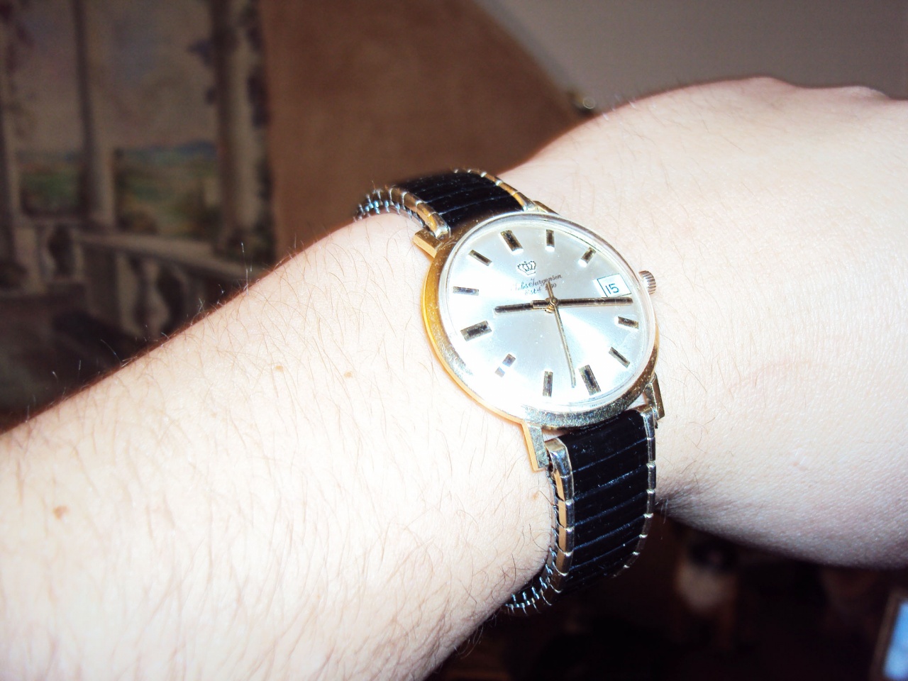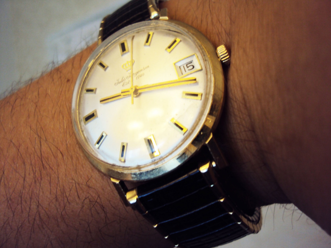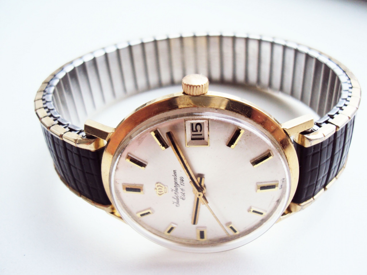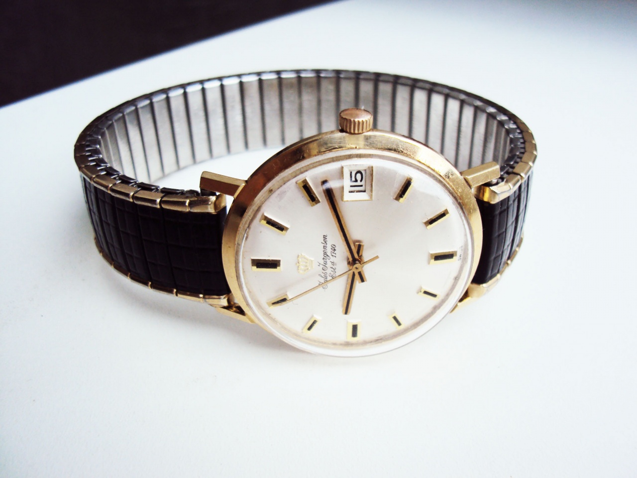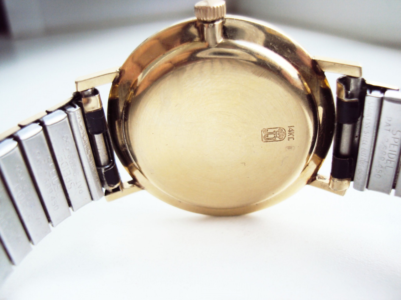 Продаются золотые наручные часы Jules Jurgensen, производство США, механизм швейцарский. Корпус выполнен из золота 585 пробы 14К. Вес корпуса без ремешка - 19.27гр. Ремешок оригинал, - материалы сталь, латунь, позолото. Выпущены в период 40х-50х годов 20 века. Часы в отличном состоянии, прекрасно выглядят и замечательно работают. Станет изысканным предметом вашего имиджа или украшением коллекции.