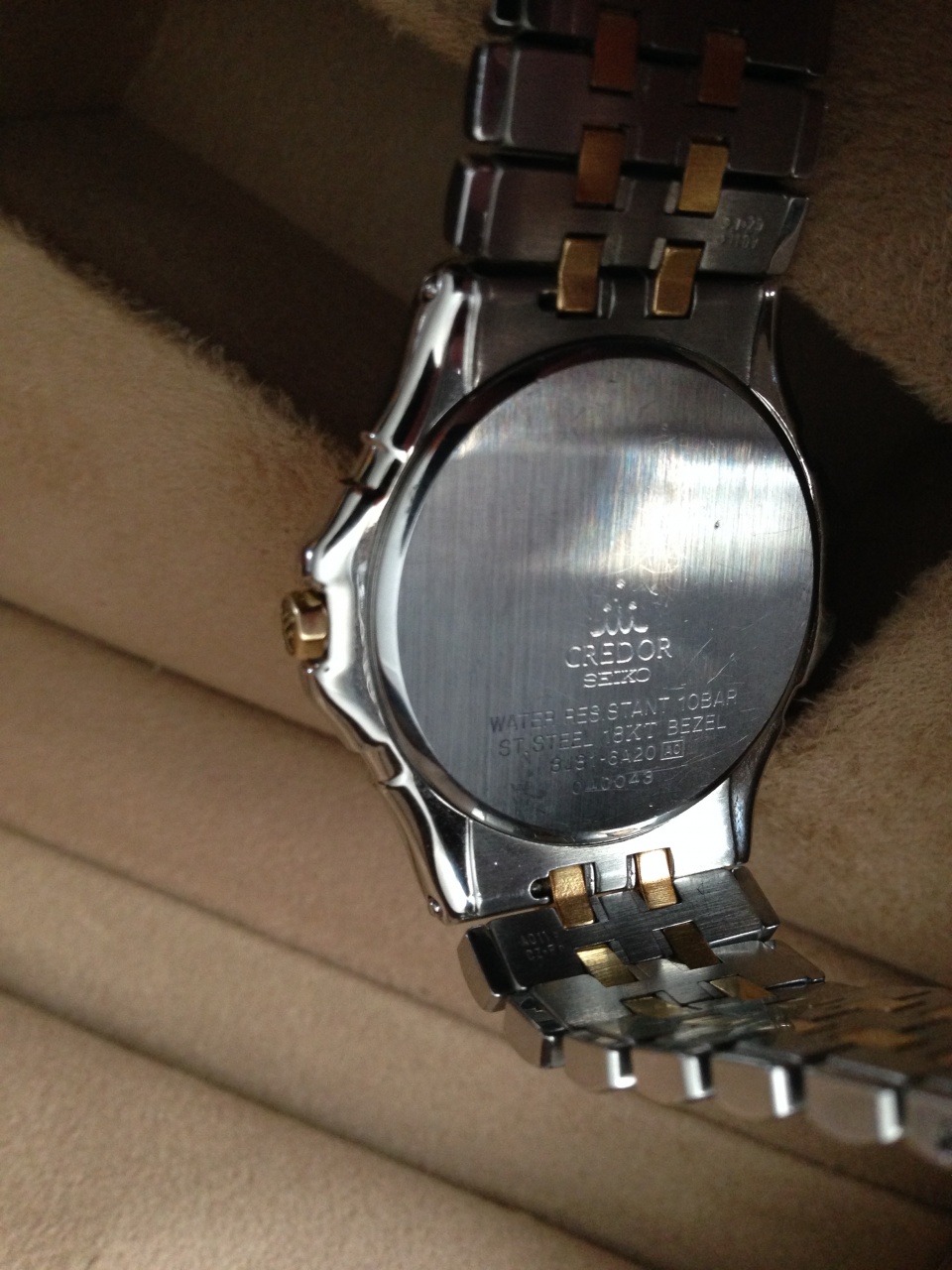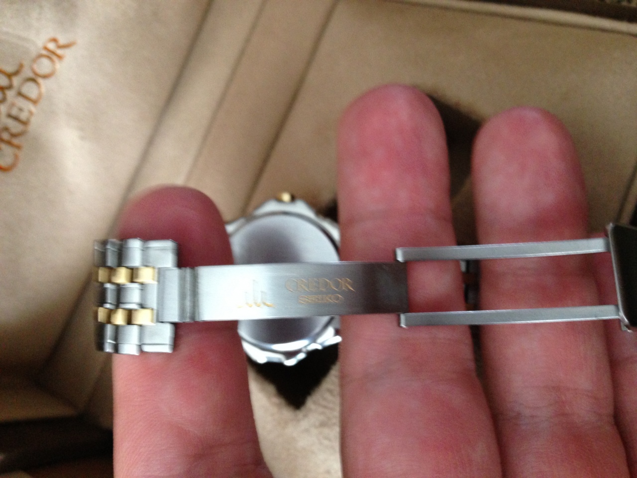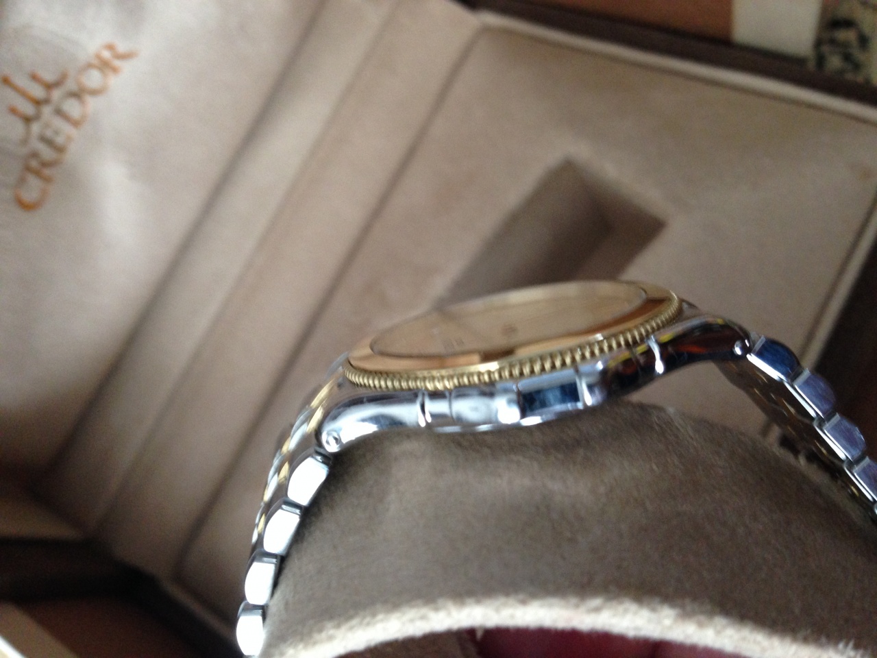 Продается вот такой биколорный Кредор. Калибр кварцевый 8J81. Часы небольшие, примерно 36 мм в диаметре. Браслет сантиметров на 18. Состояние практически идеальное. Покупались б/у у япошек, поэтому история их обслуживания мне, естественно, неведома. Номер начинается на 00.
