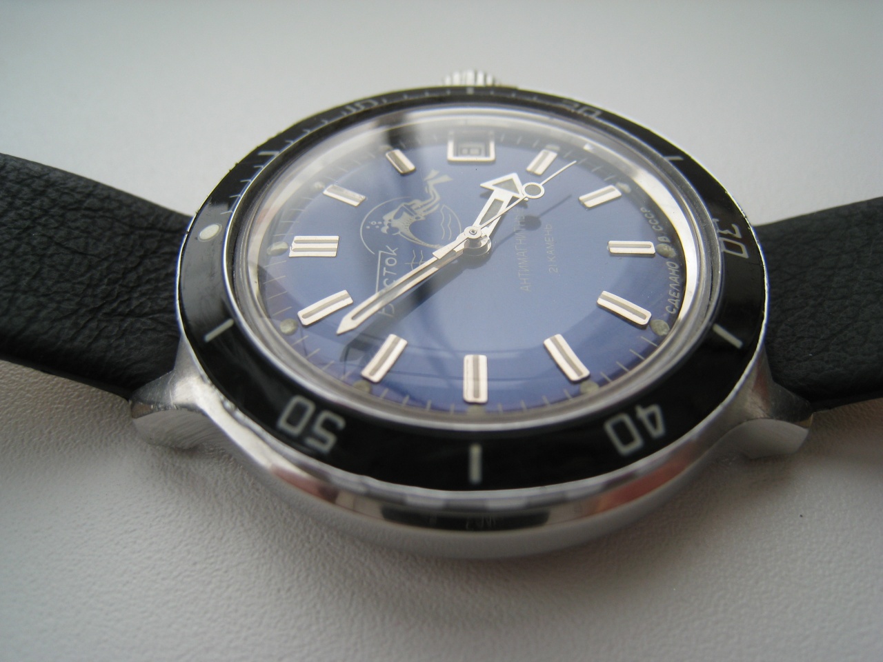 Темно синий циферблат с переливом, серебристые стрелки и метки без единого изъяна, отлично сохранившийся корпус с возможностью носить часы на ремне, а не на браслете, поворотный черный безель с едва заметными потертостями и новое армированное стекло – таков результат.