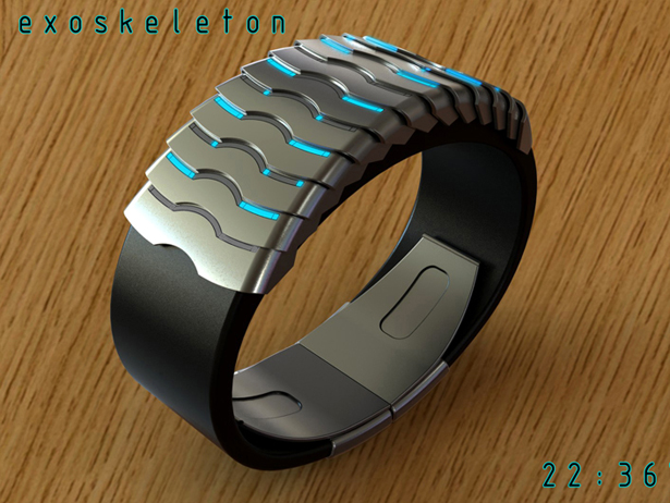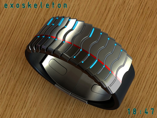 Дизайнер компании Питер Флетчер создал очень необычный дизайн-проект часов, а затем сделав ремейк его снова с ещё более технологичной внешностью. И вот мы уже смотрим на часы-экзоскелет для Вашего запястья. Из самого названия Вы могли бы уже понять, что на его создание Питера Флетчера вдохновила современные технологии создания брони и скелетные особенности. Так, его часы представляют собой соединённые между собой пластинки, которые охватывают Ваш лучезапястный сустав. Промежутки между этими пластинами используются, чтобы можно было посмотреть на светодиоды, которые показывают точное время.