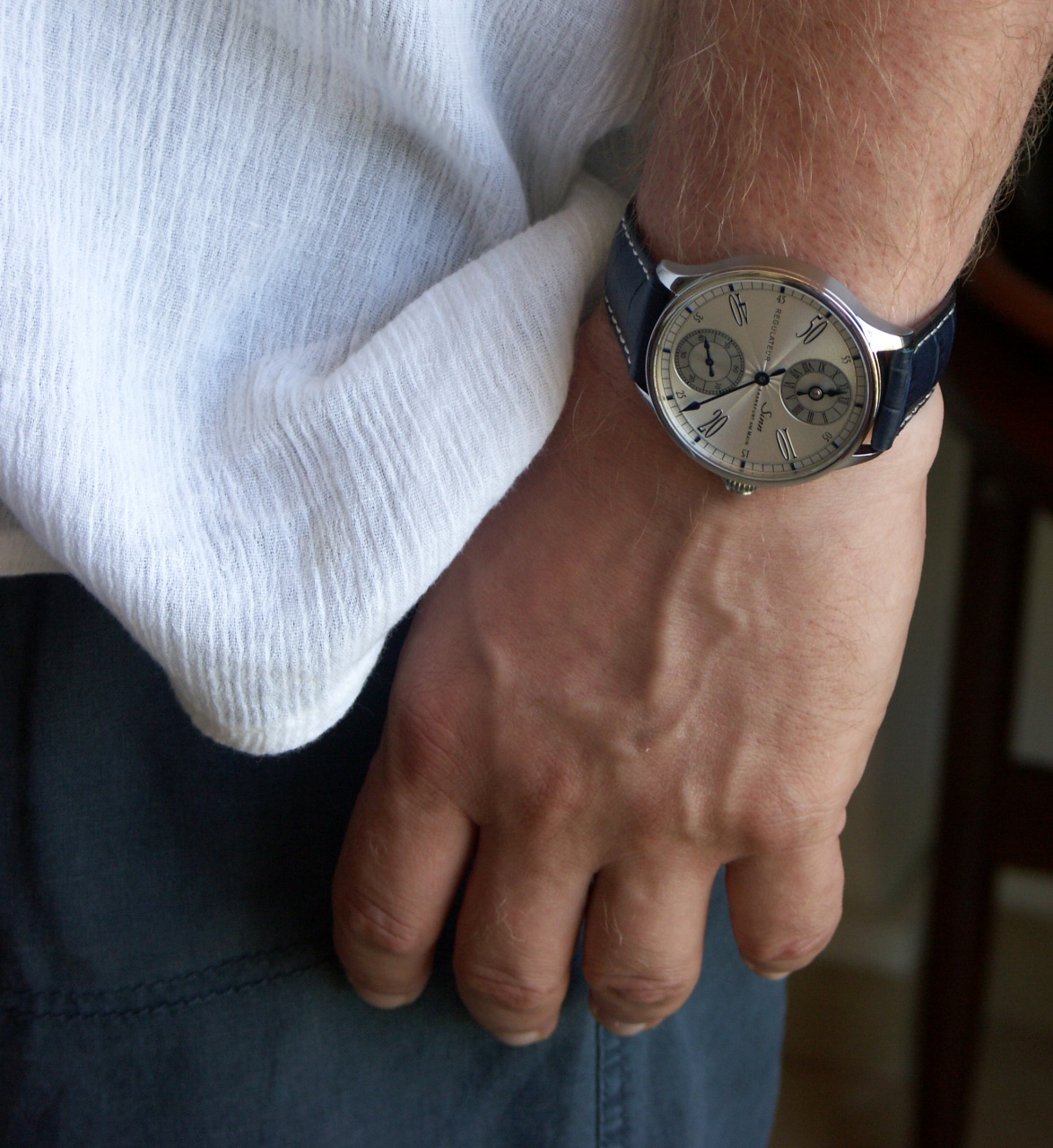 Помогает визуализации изящества очень тонкий безель. Еще чуть-чуть, и можно под пиджак, как Номос, как Штову. Классика, дроблена канитель! Но тут на авансцену выходит синий ремешок, который подсказывает цвет костюма, надеваемый поверх часов…