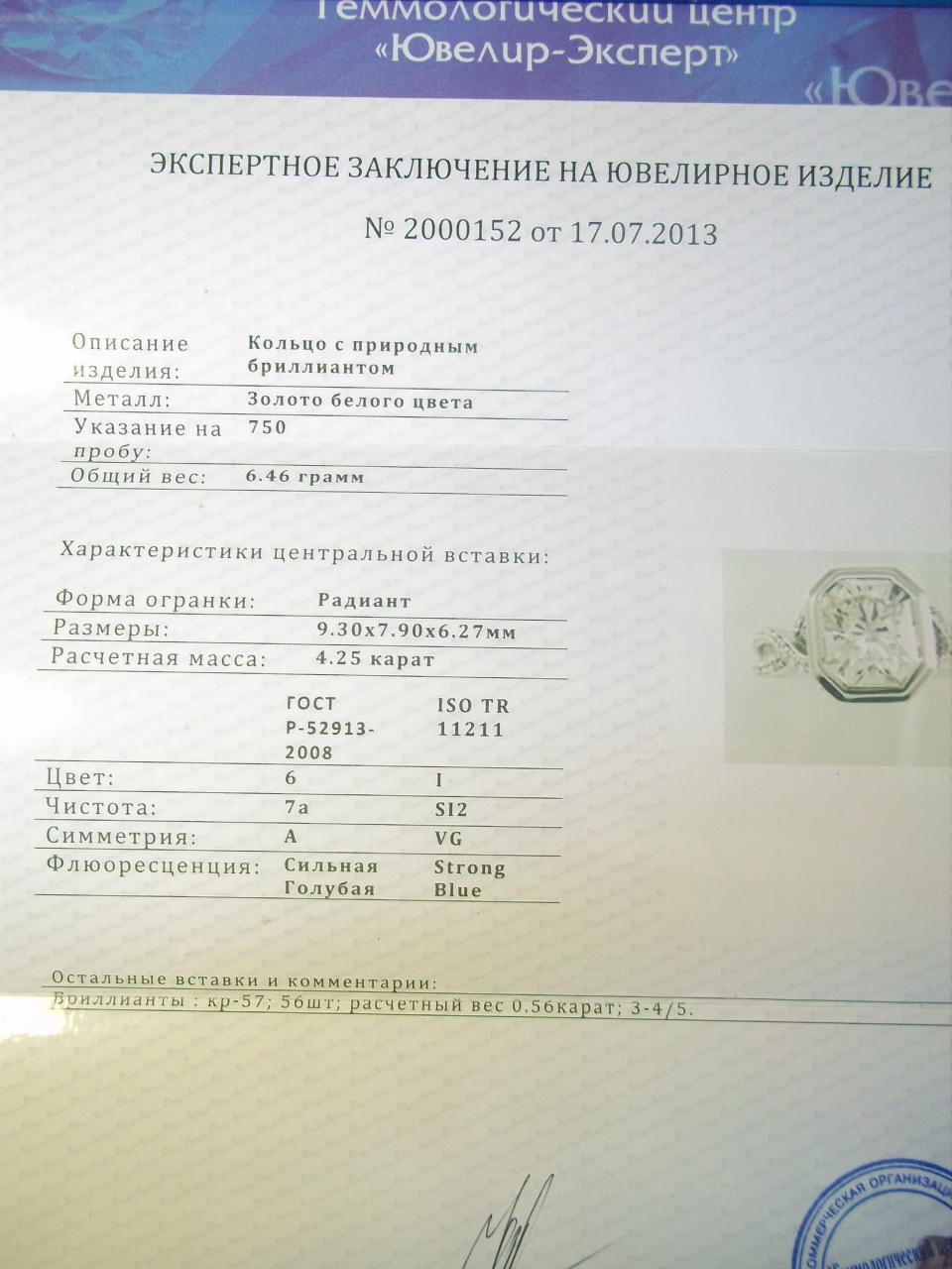 Бриллиант 4.25 карат,цвет/чистота I / SI 2 (мельчайшие включения видны только в микроскоп), цена камня по рапапорту 42 000 usd, по ТУ-в районе 50 000 usd , белый камень с великолепной игрой