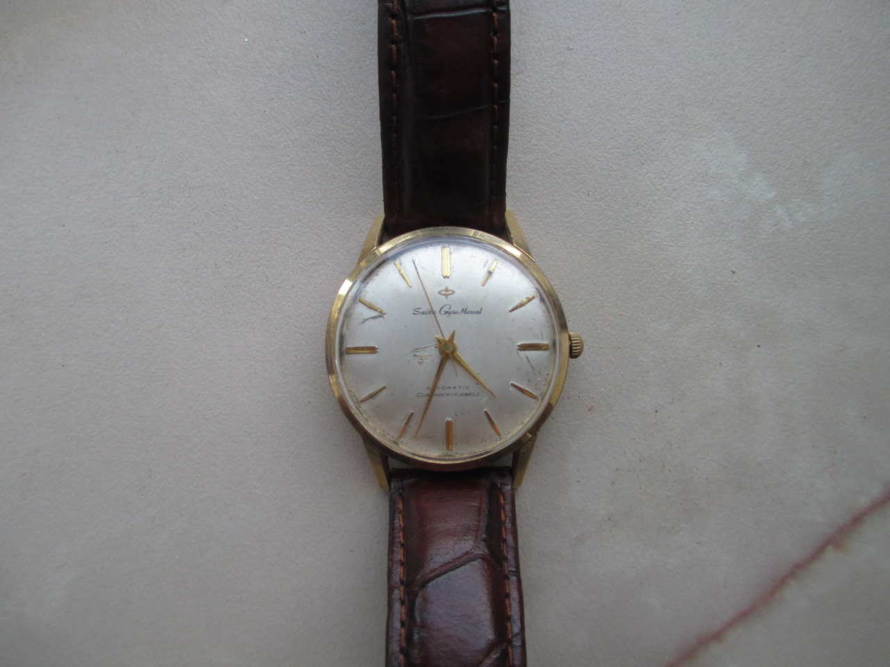 Продаются часы Seiko Gyro Marvel год 1959-1960. Первые Seiko на автомате с коммерческим успехом. Поскольку часы производились только в этот период, поэтому соответственно, предположение о годе. Циферблат поврежден, как видно на фото. Позолота 20 карат. Теперь по механизму. Часы отстают секунд на 30 в сутки. Носил в мастерскую, сказали, что по-хорошему надо почистить, но не критично, ротор работает хорошо и часы полностью готовы для носки или в коллекцию. Регулировка хода - 200 рублей.Спешите купить кусочек истории Seiko.
