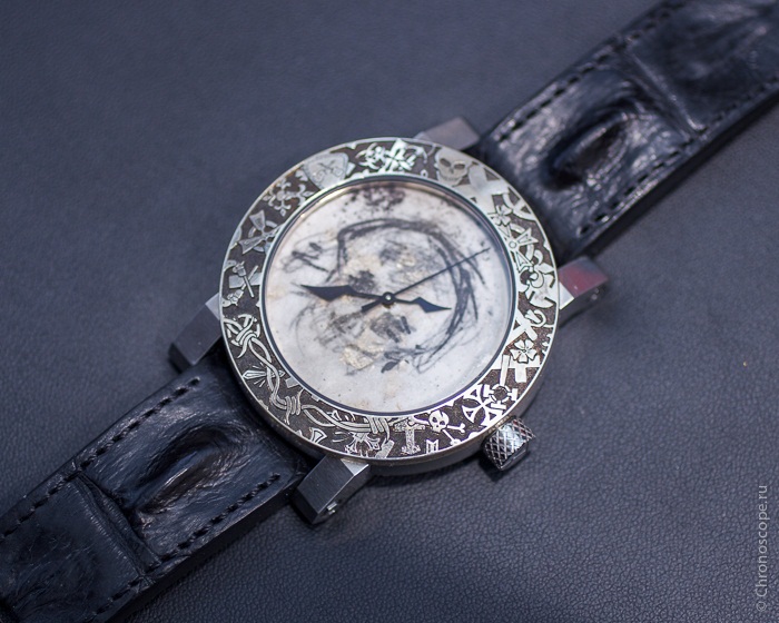 А этот череп смеется над желанием приобрести элегантные часы, элитной марки, отделанные с изяществом и роскошью, созданные в соответствии с последними модными тенденциями. «Лучше поддержи доброго, мало кому известного гравера, который делает то, что он хочет, а не то, что ему велит отдел маркетинга», — говорит череп.