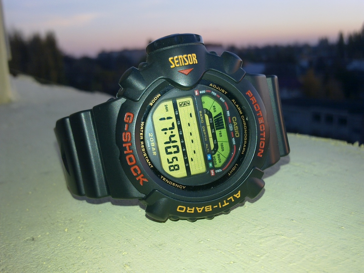Водонепроницаемые 200 метров (20 атмосфер), противоударность G-Shock.