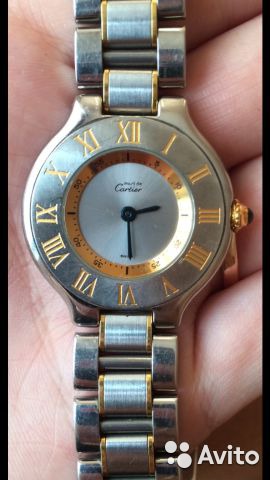 Оригинальные часы Cartier модель 1340 (must de cartier 21). Механизм кварцевый. Состояние хорошее. Заводная головка украшена сапфиром. Стекло сапфировое
