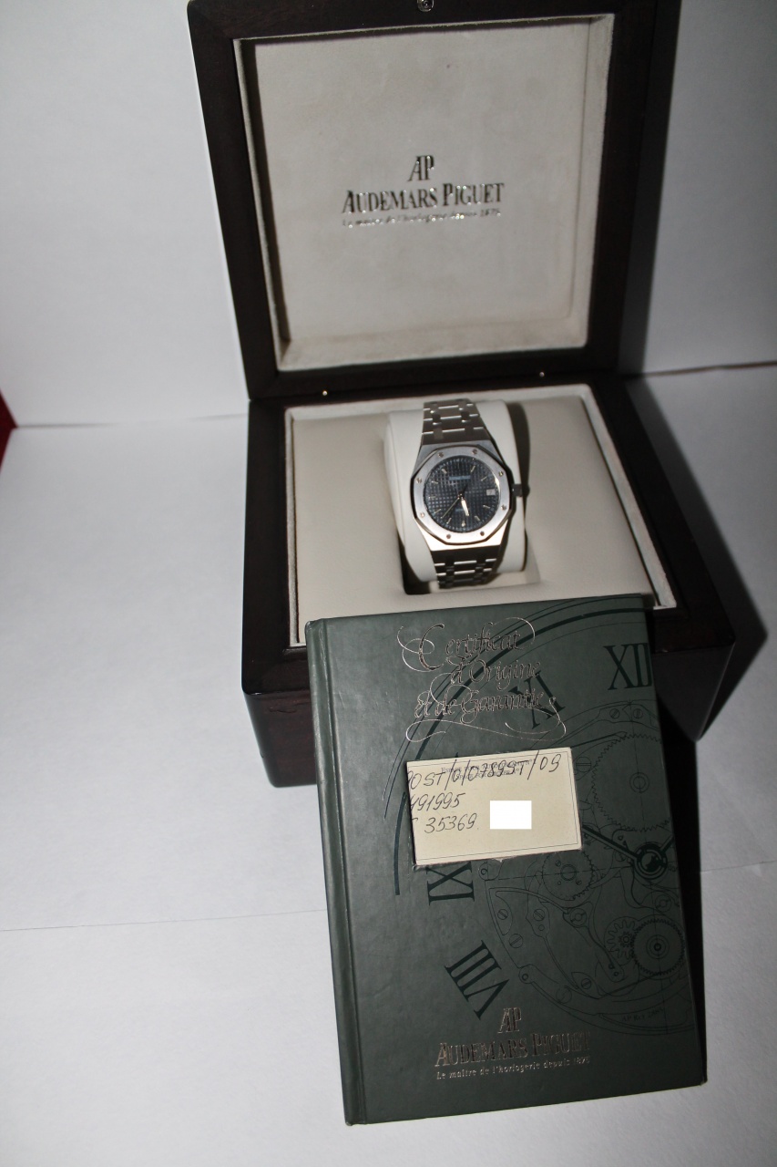 Audemars Piguet Royal Oak, размер корпуса 36*50 мм, толщина 8 мм., болты из белого золота, черный циферблат. Браслет на запястье до 18 см. Репассаж в 2010 г., полировка с регулировкой в 2014г., квитанции есть. Отличное состояние. Любые проверки.