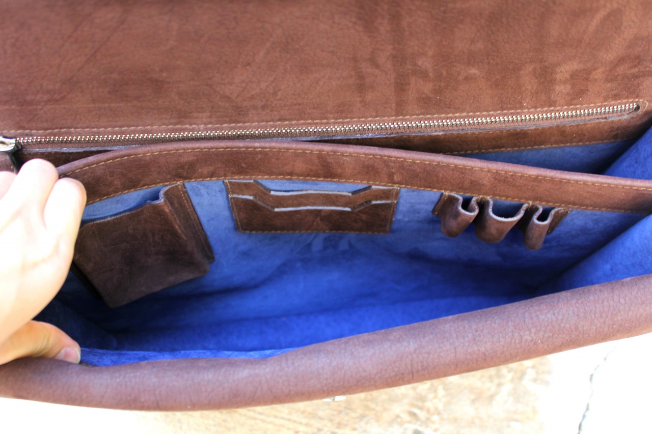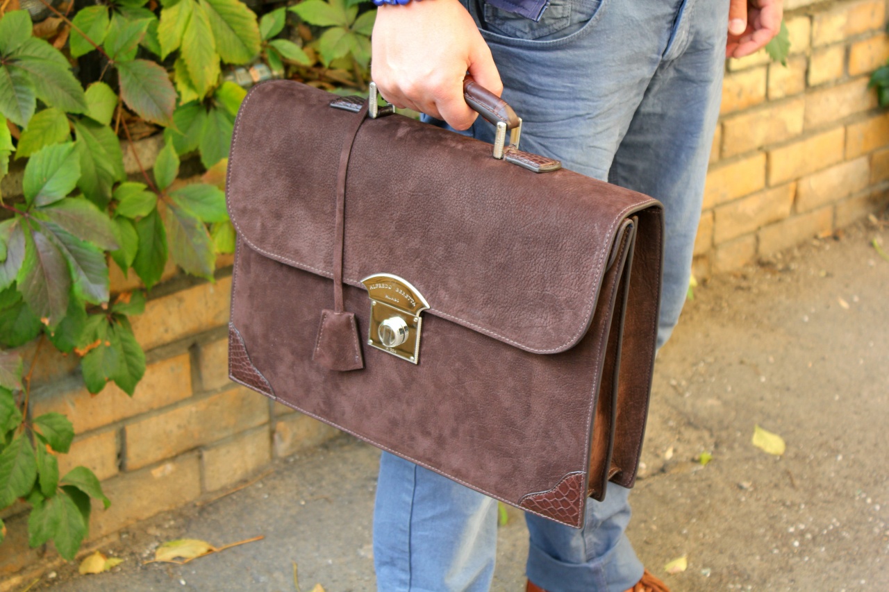 Классический мужской портфель ручной работы «Alfredo Beretta». Цвет темно-коричневый. Изготовлен из 100% буйволиной кожи высочайшего качества выделки, шлифованная под замшу. Портфель имеет декоративную отделку, выполненную из 100% кожи миссисипского аллигатора коричневого цвета. Портфель застегивается на замок, запирающийся на ключ. Детали и декоративные элементы портфеля изготовлены из стали, покрытой палладием. Внутренняя часть портфеля изготовлена из 100% замши латиноамериканских пекари синего цвета, и имеет два больших отделения для переноски документов и прочих вещей, потайные отделения для переноски планшетных компьютеров типа iPad или компактных ноутбуков, хранения ценных бумаг или особо важных документов, одно дополнительное отделение, застегивающееся на молнию с бегунком, и кармашки для хранения 3 ручек, смартфона, визитных карточек.