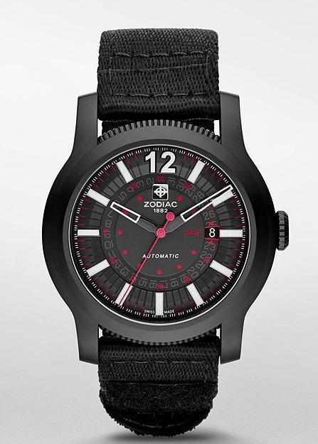 Новая модель Jet-O-Matic от швейцарской часовой компании Zodiac имеет круглый корпус, изготовленный из нержавеющей стали или из нержавеющей стали с черным ионным покрытием, диаметром 46,0 мм, толщиной 15,0 мм, водонепроницаемый до 100 метров. На торце завинчивающейся рифленой заводной головки, расположенной на 3 часах, выгравировано изображение эмблемы бренда Zodiac. Сапфировое стекло установлено на передней стороне часового корпуса и на его завинчивающейся задней крышке. Циферблат черного или оливкового цвета с арабскими цифрами, часовыми индексами покрытыми, как и скелетонизированные часовая и минутная стрелки, люминесцентным составом белого цвета.