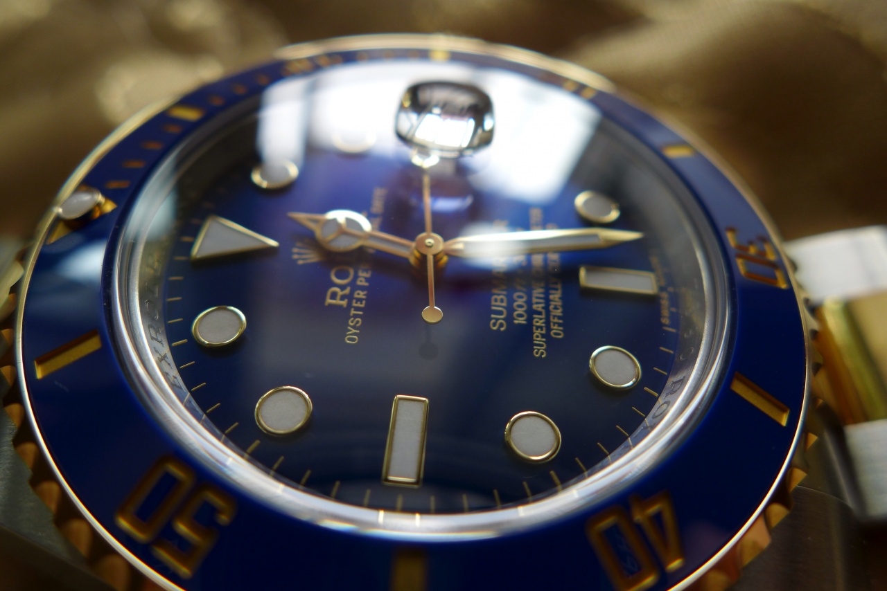 Несмотря на некоторое внешнее сходство, часы, безусловно, очень разные. Rolex построен на базе собственного калибра 3135 сертифицированного COSC, имеющего автоподзавод. В то же время, данный Longines Hydro Conquest – это обычный, классический кварцевый ЕТА. Да, Вы не ослышались: они работают от батарейки, это швейцарская Renata 371. Часы имеют круглый стальной корпус с синим циферблатом на стальном браслете, центральные звенья браслета покрыты золотым PVD, также как и безель. Золотистый безель Longines имеет покрытие синего цвета. А вот у Rolex на безеле уже стоит керамика, в отличие от предыдущей модели, у которой синее кольцо на безеле было из металла.