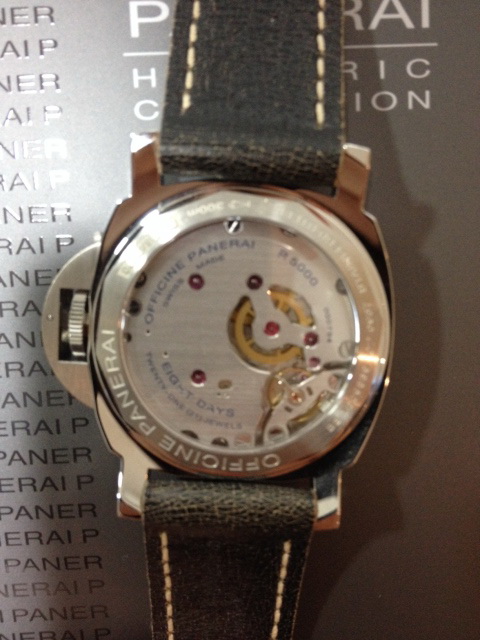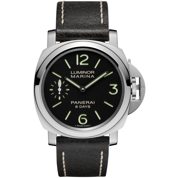 -У модели удобный 44-миллиметровый корпус. Функционал классический — часы, минуты, маленькая секундная стрелка. Внутри стоит мануфактурный калибр P.5000, который выполнен в стиле механизмов старой «панерайской» школы. Благодаря прозрачной задней крышке можно полюбоваться на его минималистскую отделку. Завод у калибра ручной и отличается этот «движок» впечатляющей выносливостью — два заводных барабана обеспечивают часам бесперебойную работу в течение 8 суток. -