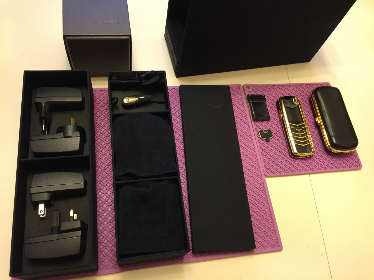 В комплекте есть все: телефон Vertu Signature с разъемом для полноразмерной SIM-карты, кожаный футляр для телефона, сетевое зарядное устройство с переходниками для розеток международных стандартов, ключ для того, чтобы вытаскивать аккумулятор, запасной аккумулятор, полировочная салфетка.