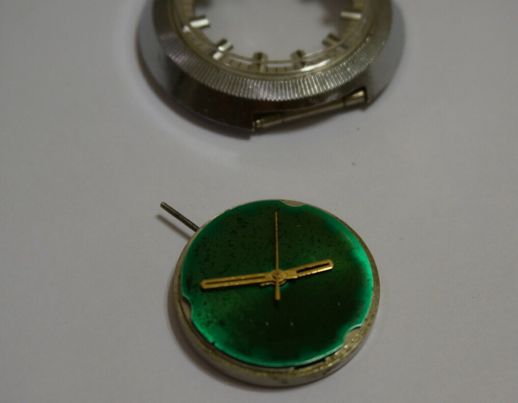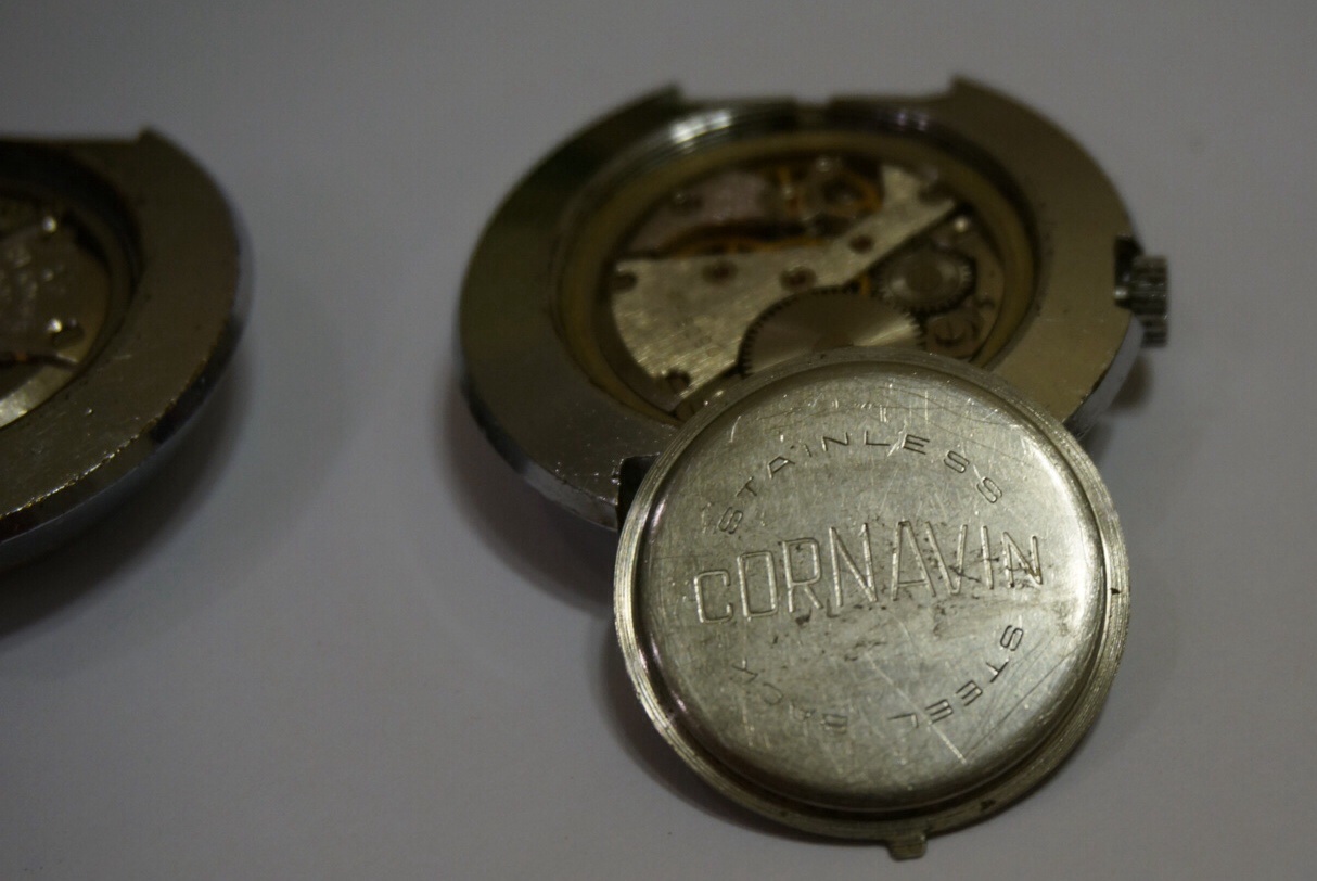 В итоге на задней крышке надпись CORNAVIN, на циферблате нет ни каких надписей, только на той части с насечками, которая к корпусу крепиться раней латиницей made in ussr. Циферблат на поверку оказался зеленым, размазанным, как вроде зеленкой набрызгана, была какая то надпись на циферблате, отпечаталась, но не разборчиво и на латинице. Внутри 2609 Н, вхорошей сохранности. Правда у меня есть еще одна Ракета - шайба советская, со словарным стеклом, распылившимся циферблатом, так что можно собрать одну.